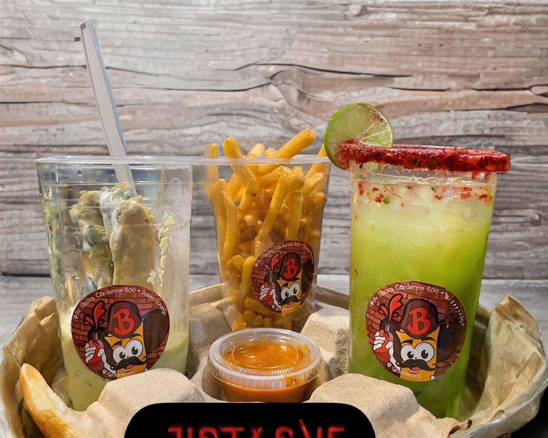 Tajín, limón, salsa, clamato y cerveza.