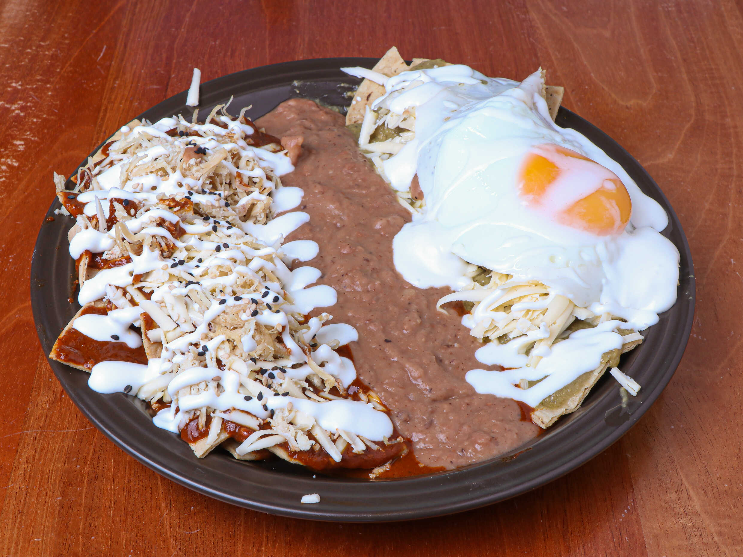 Chilaquiles crujientes bañados en una deliciosa salsa verde con un huevo, por el otro lado salsa roja y otro huevo decorados con queso menonita. Acompañados de frijolitos.