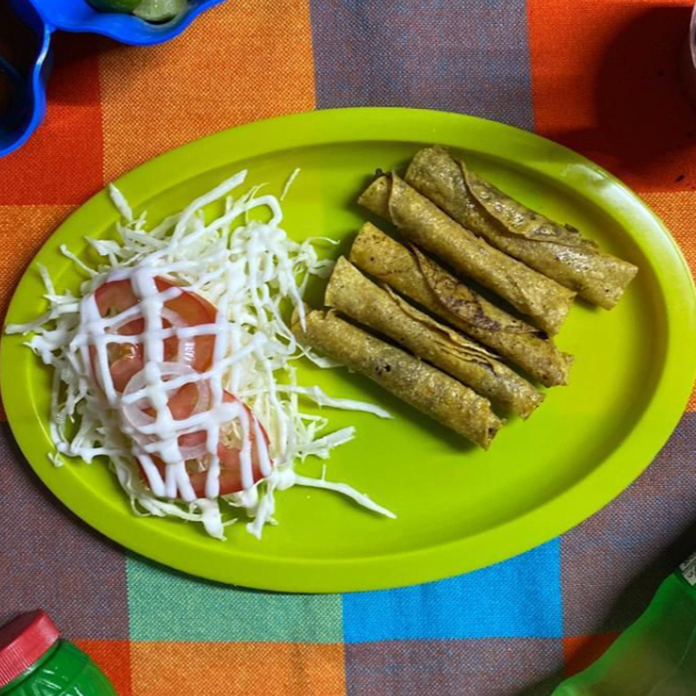 Seis tacos crujientes por fuera y llenos de sabor por dentro. Rellenos de Papa, Deshebrada o Frijoles.