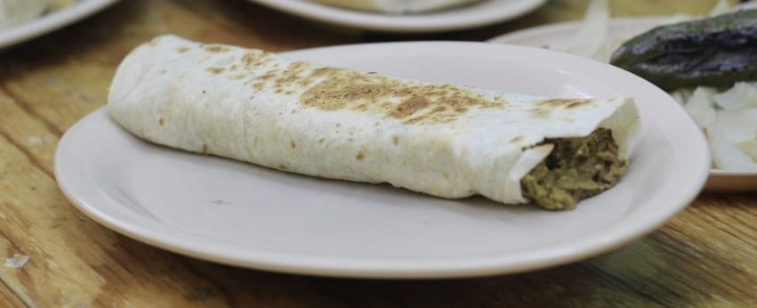En Tortilla de Harina con Queso y Carne al Pastor.