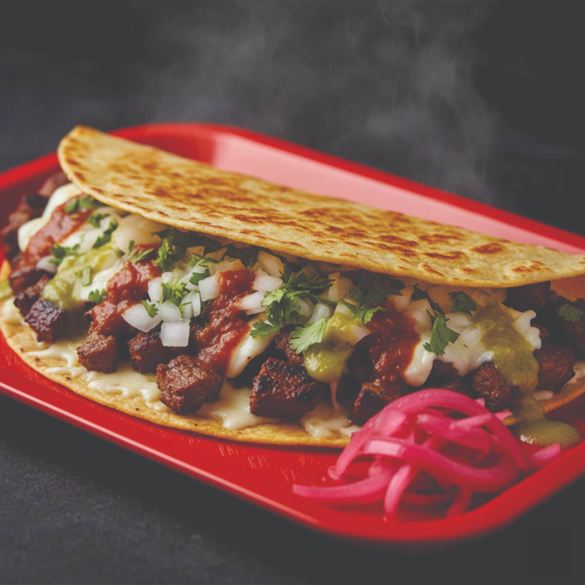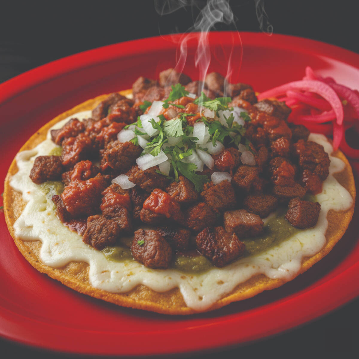 Tortilla de maiz tostada a la plancha con queso, de Asada y/o Pastor acompañados con cebolla, cilantro, cebolla morada con habanero, limones y salsas roja y verde