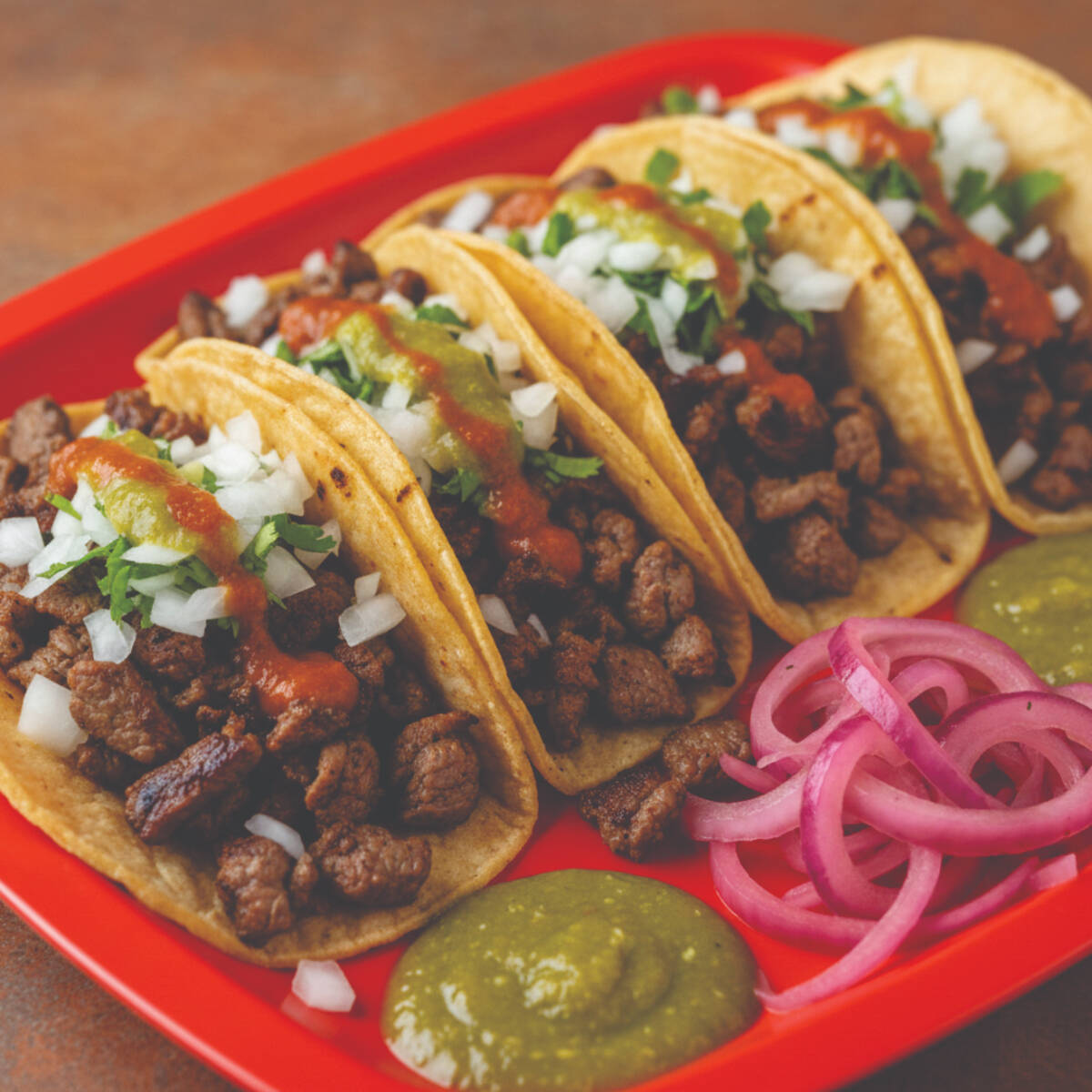 5 Tacos de Asada y/o Pastor acompañados con cebolla, cilantro, cebolla morada con habanero, limones y salsas roja y verde