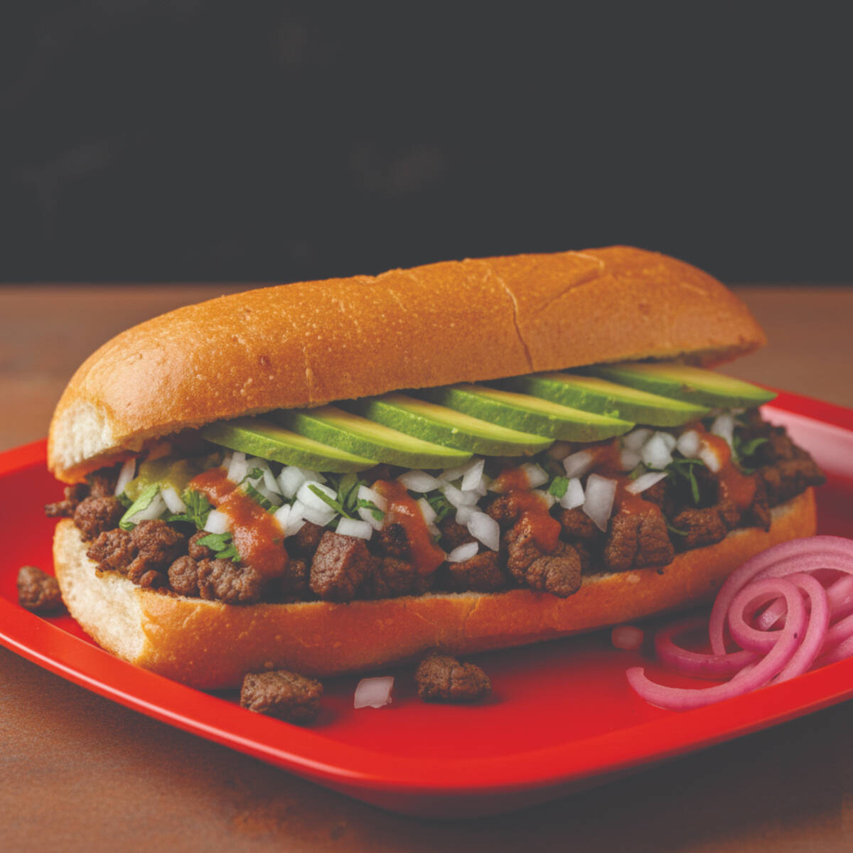 Torta con mayonesa, aguacate, de Asada y/o Pastor acompañados con cebolla, cilantro, cebolla morada con habanero, limones y salsas roja y verde