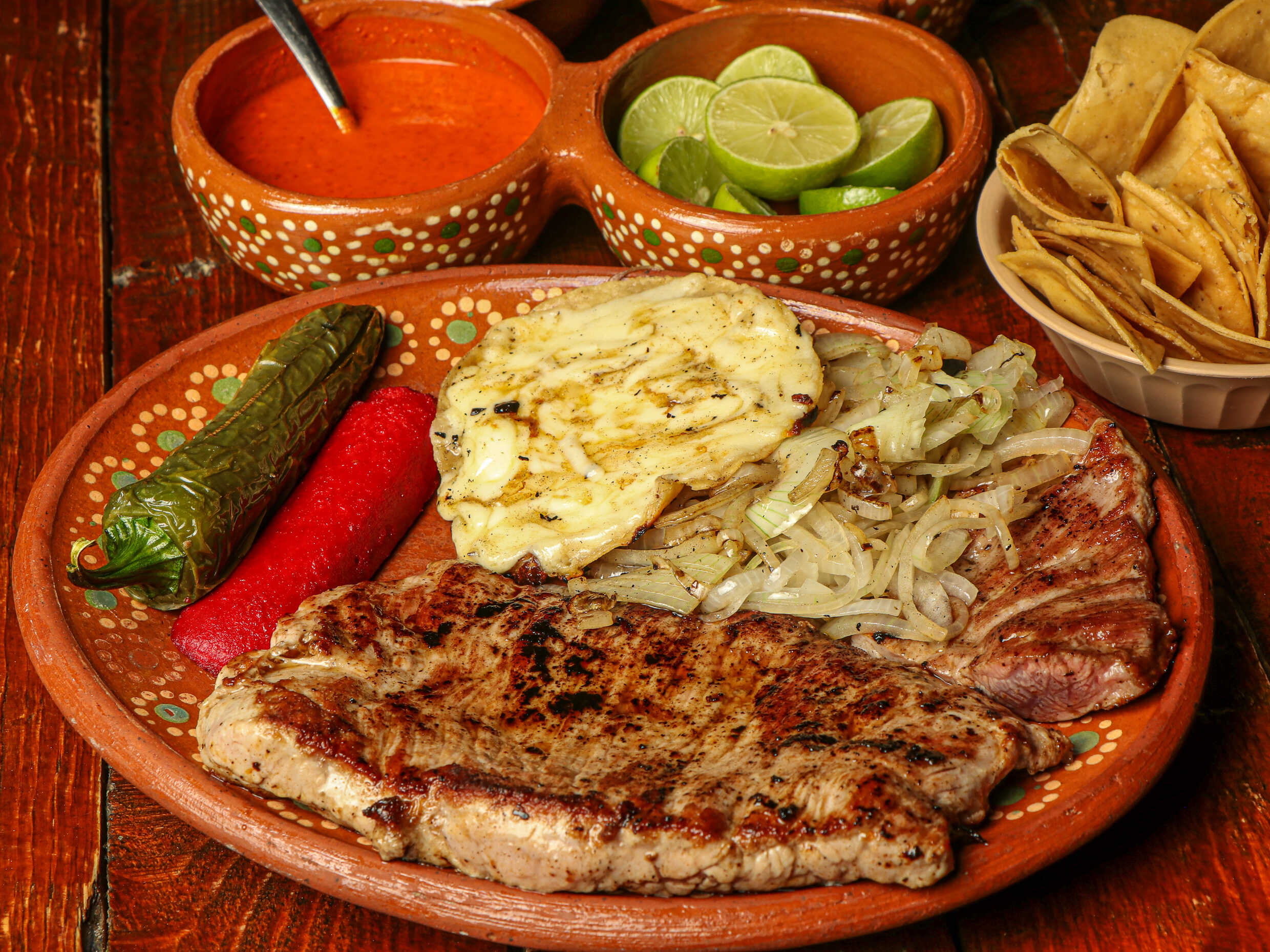 Pollo, rib steak, arrachera y costilla cargada, acompañado de cebollitas y chiles asados, salchicha asada, tomate, aguacate y tortillas.