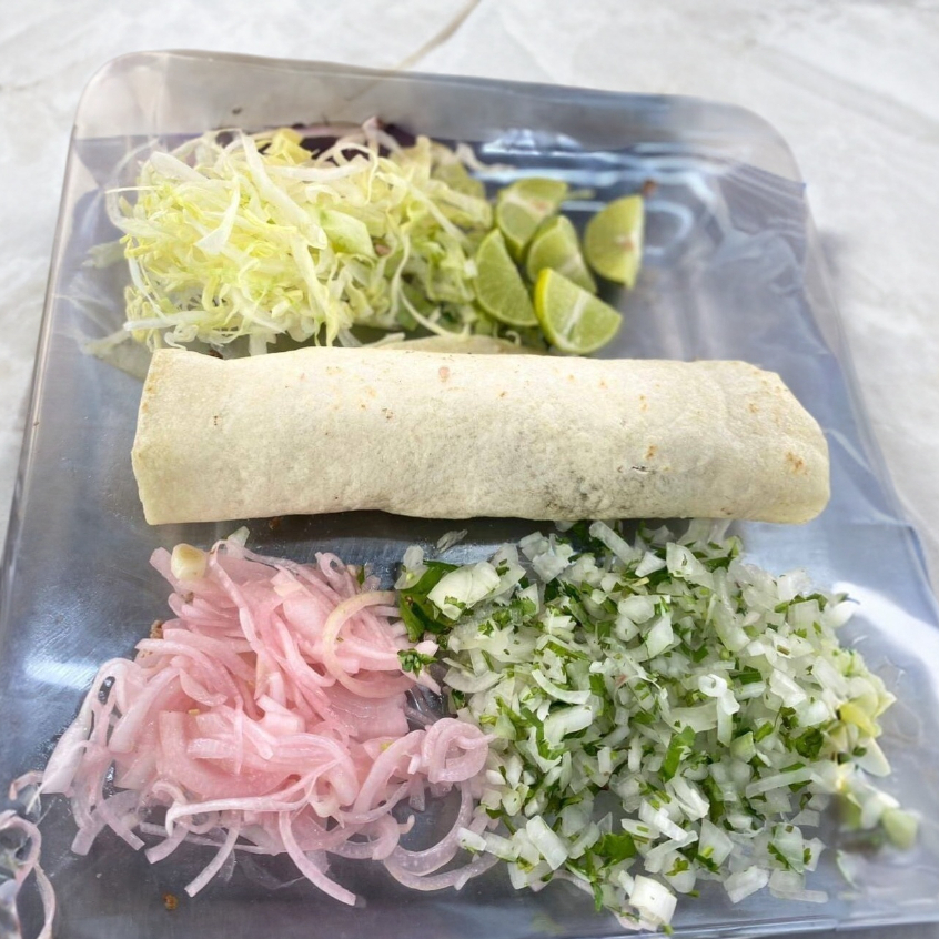Burrito de carne asada,complementado con lechuga,salsas,cebolla con cilantro y limón.