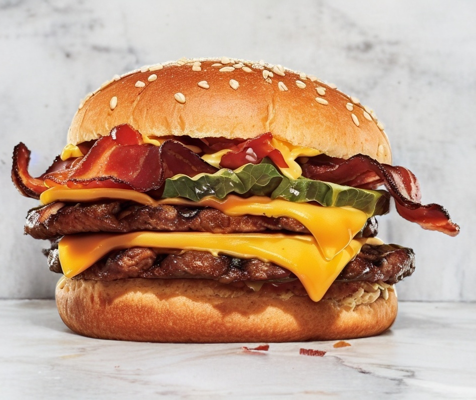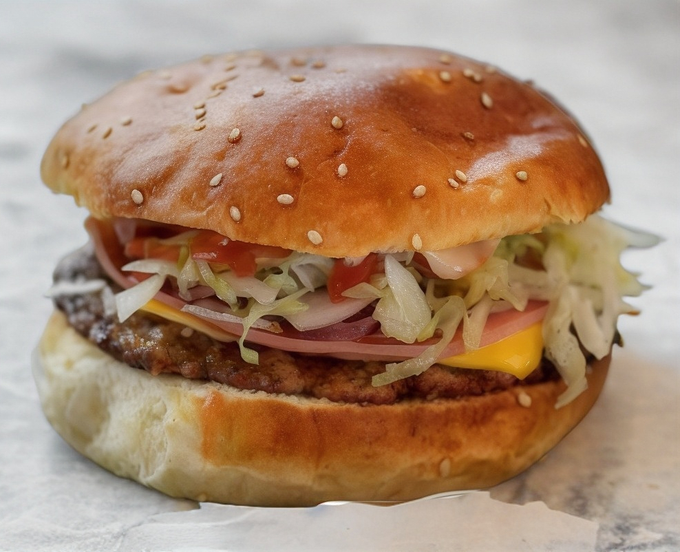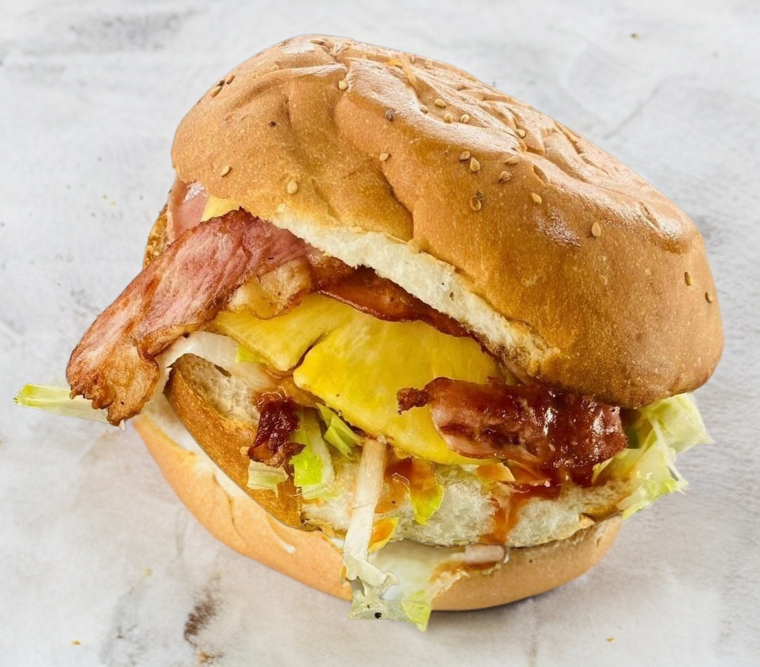 Doble carne, doble tocino, doble jamon, doble píña y queso amarillo, lechuga, tomate, cebola, catsup, mostaza, aderezo