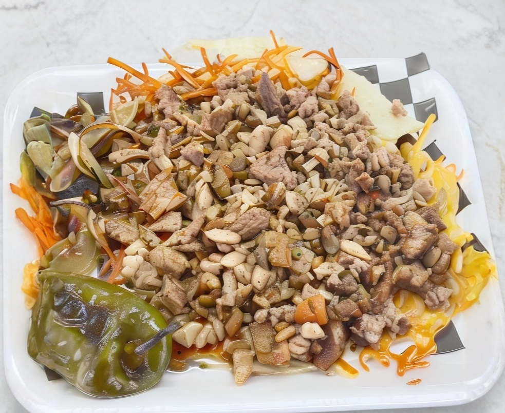 chile poblano, cebolla asada, jamon,porcion de carne asada, queo gratinado. complementado con tortillas de maiz ,lechuga limon, salsas y cebolla con cilantro