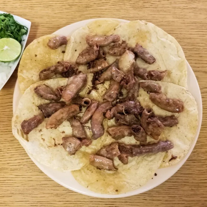 Tortilla de harina con tripas acompañado de aderezo y cebollitas asadas