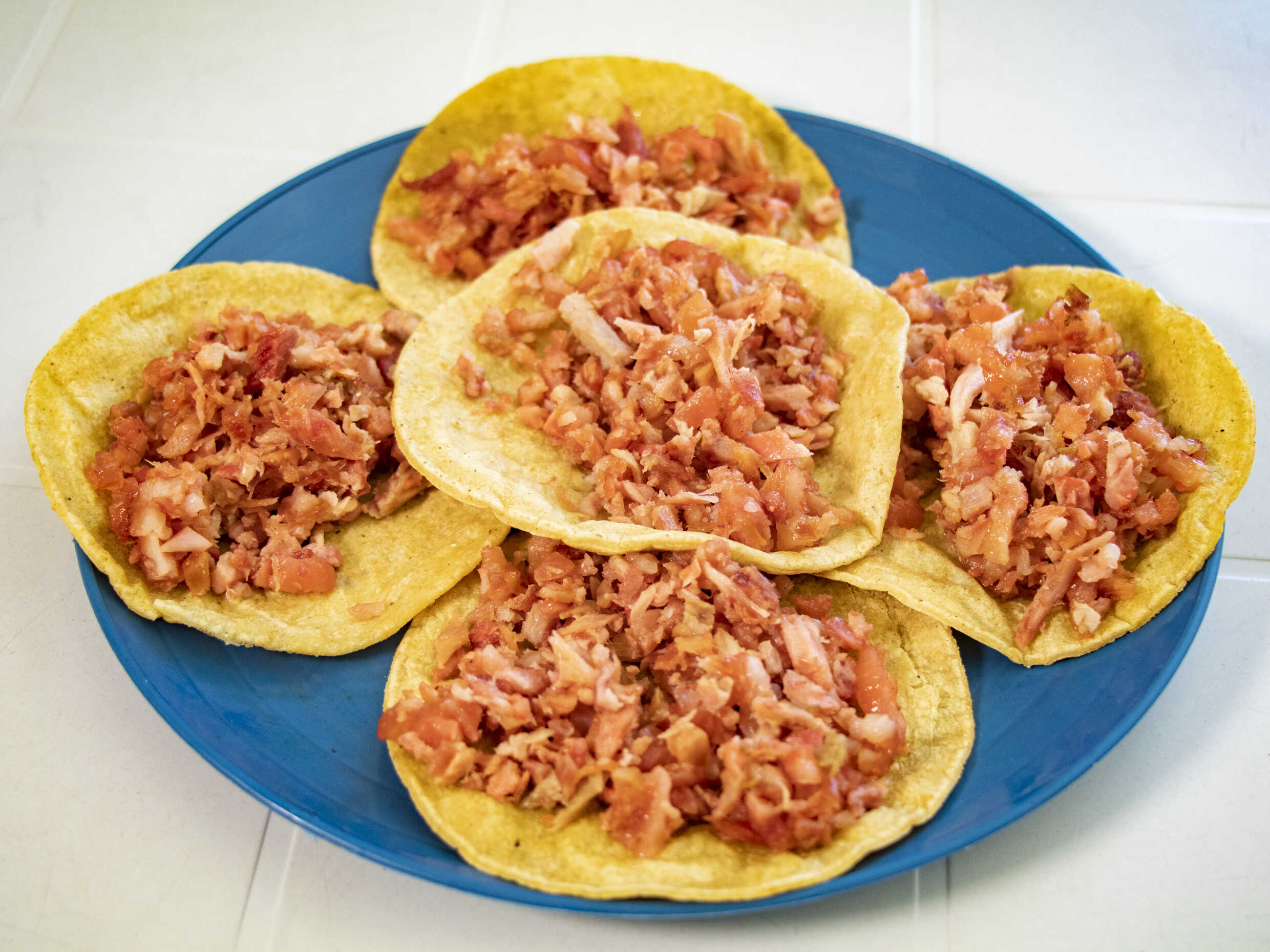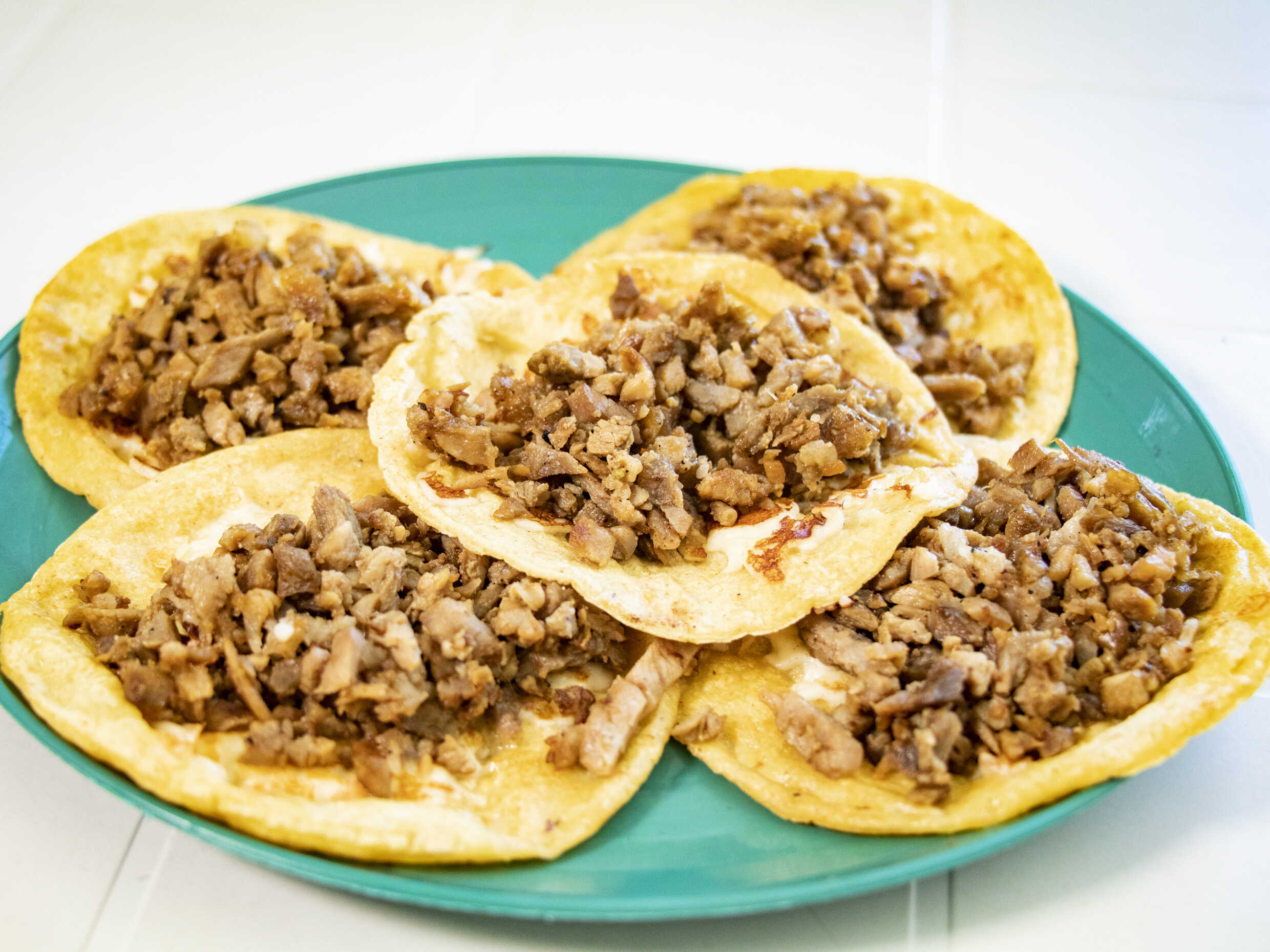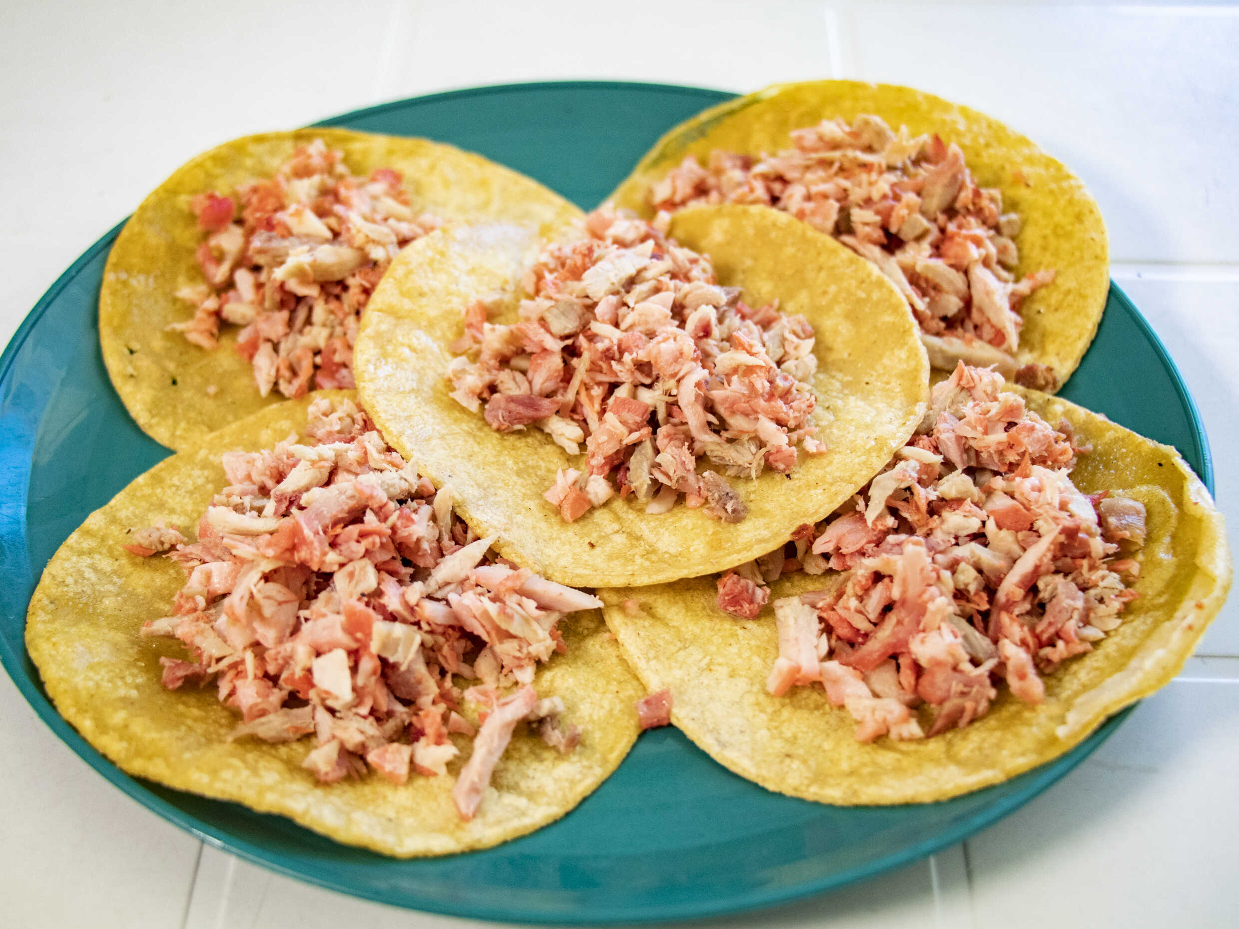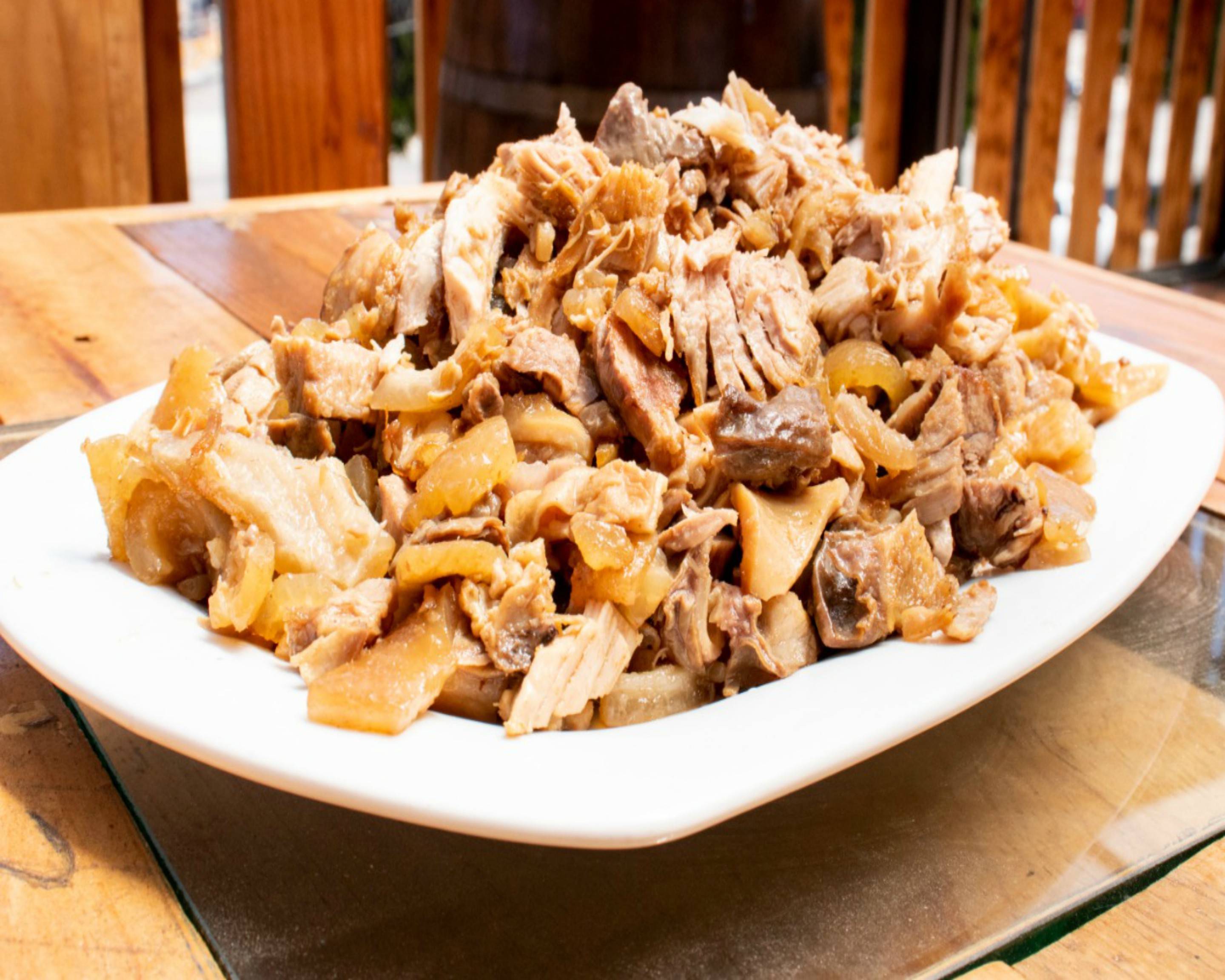 Medio kilo de carnitas (cuerito con maciza) + 10 tortillas + dos salsitas + cebolla con cilantro + limones