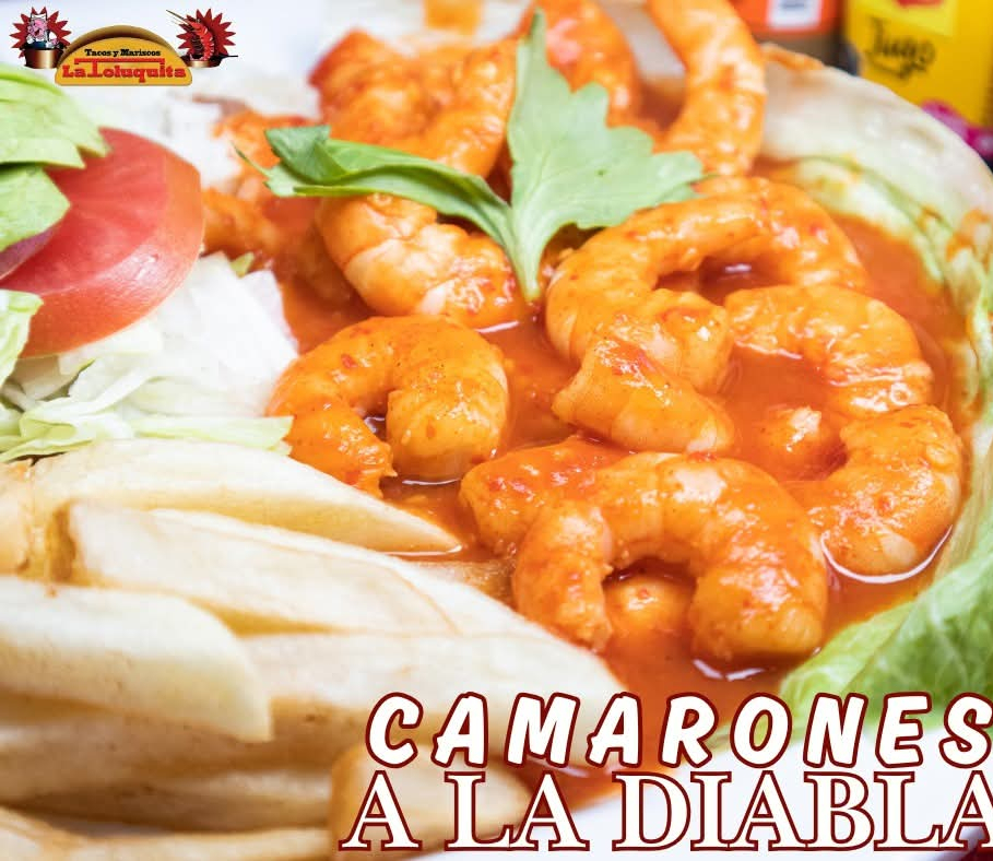 Espectaculares Camarones a la Diabla acompañados de Ensalada y Papas.