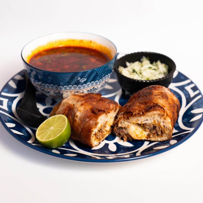 Bolillo relleno de birria y queso, envuelto en tocino mas 400 ml de consome