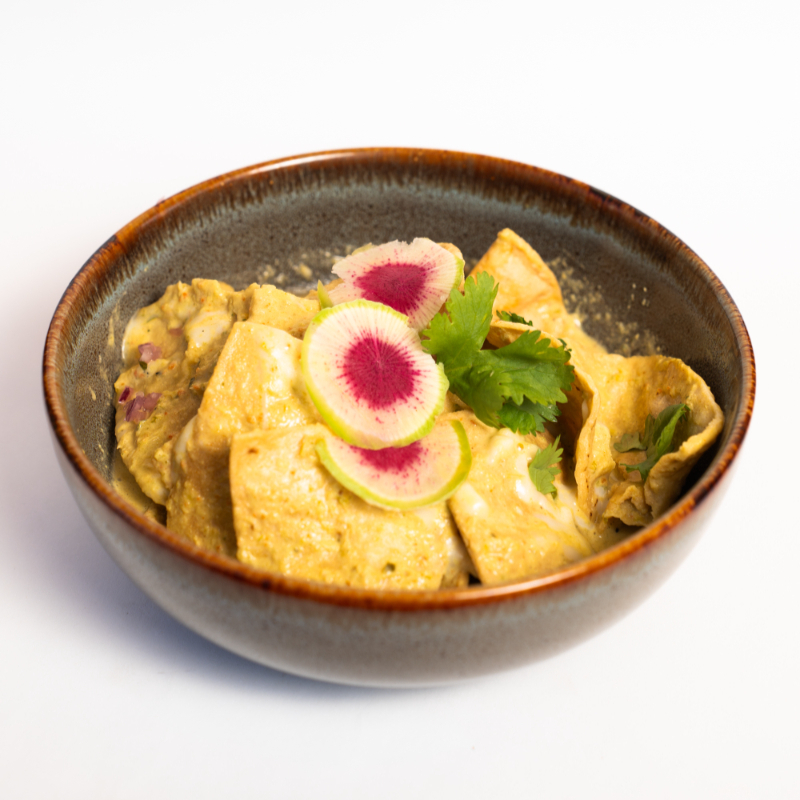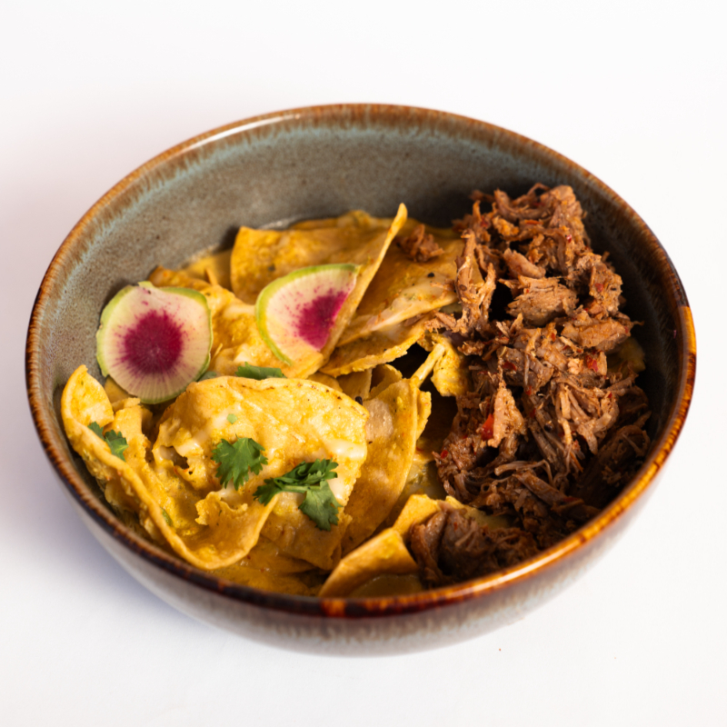 Totopos bañados con salsa poblana cremosa mas birria y queso