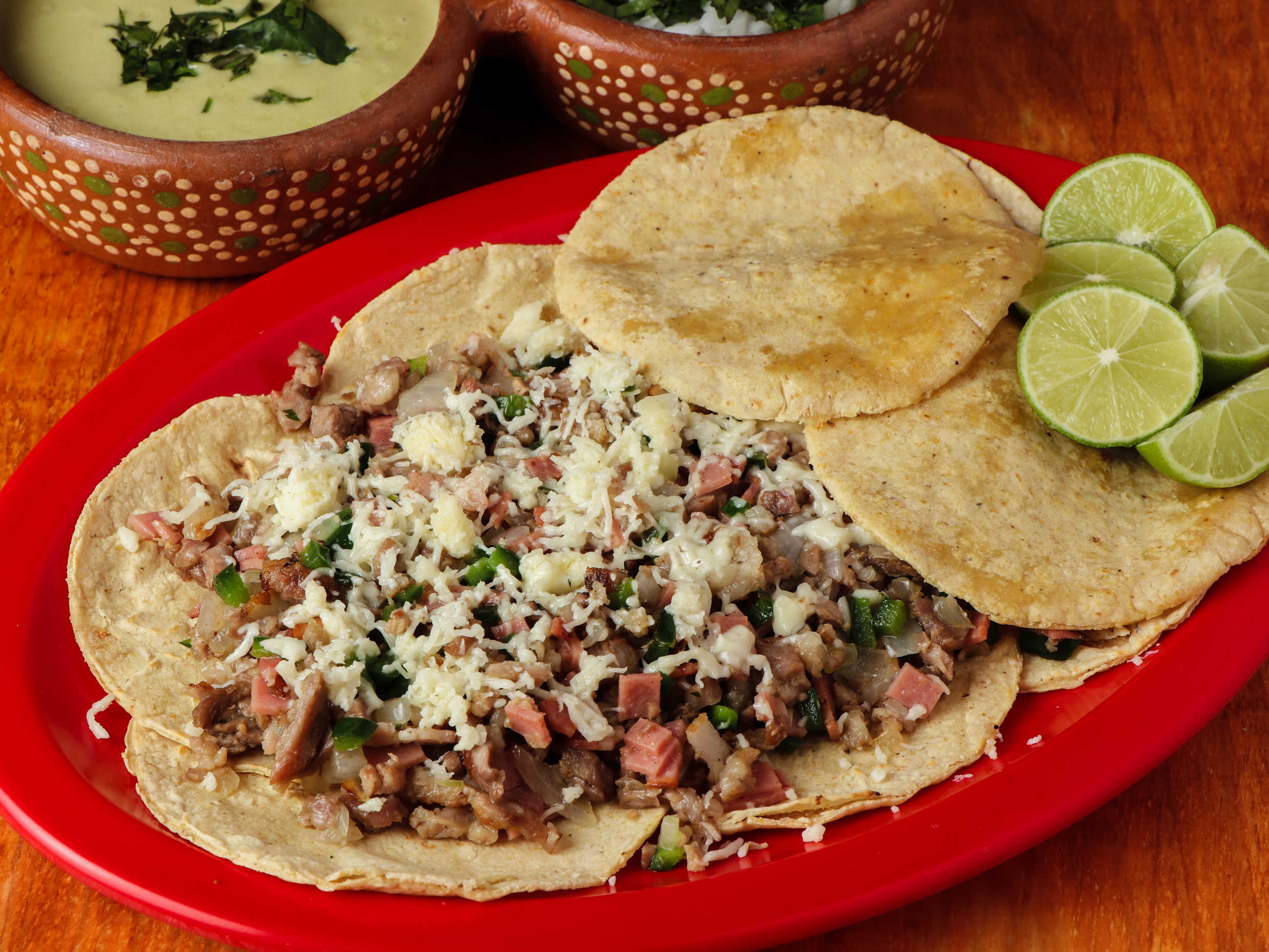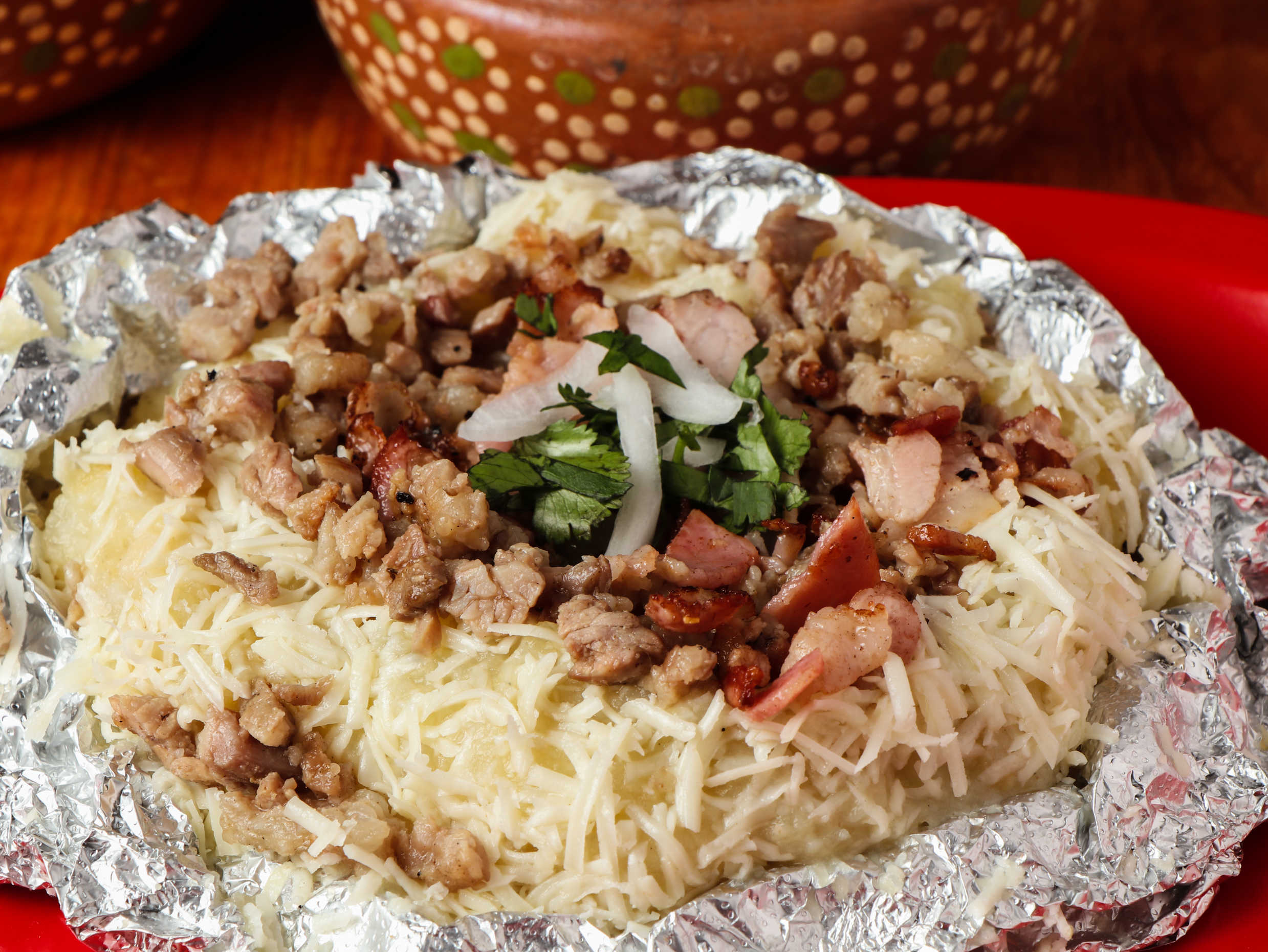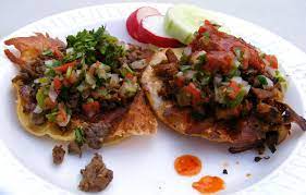 mantequilla, tocino, queso y carne Al Pastor