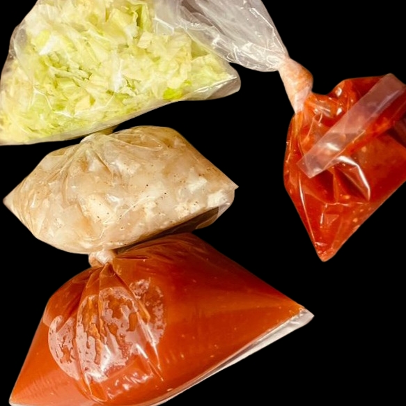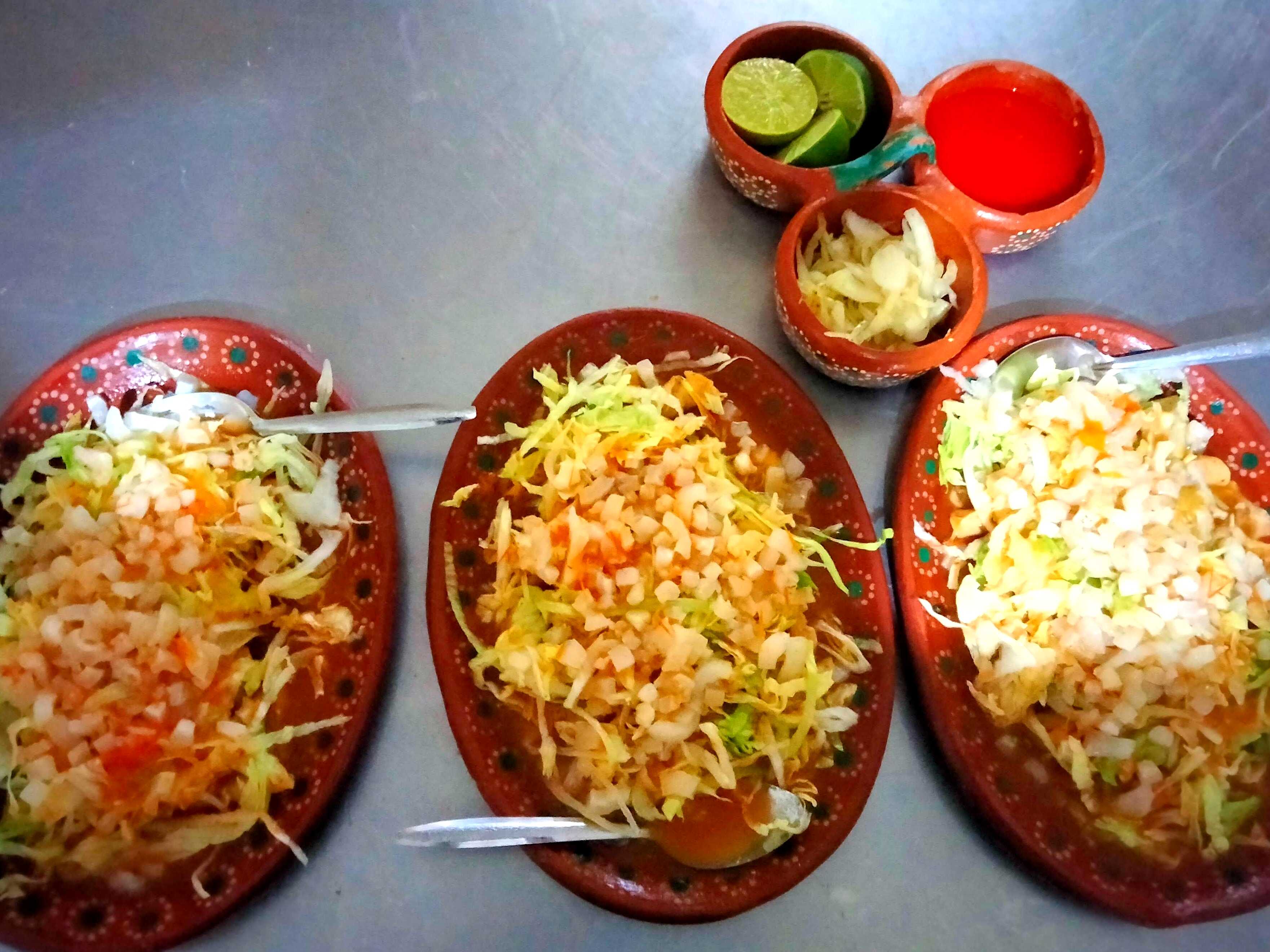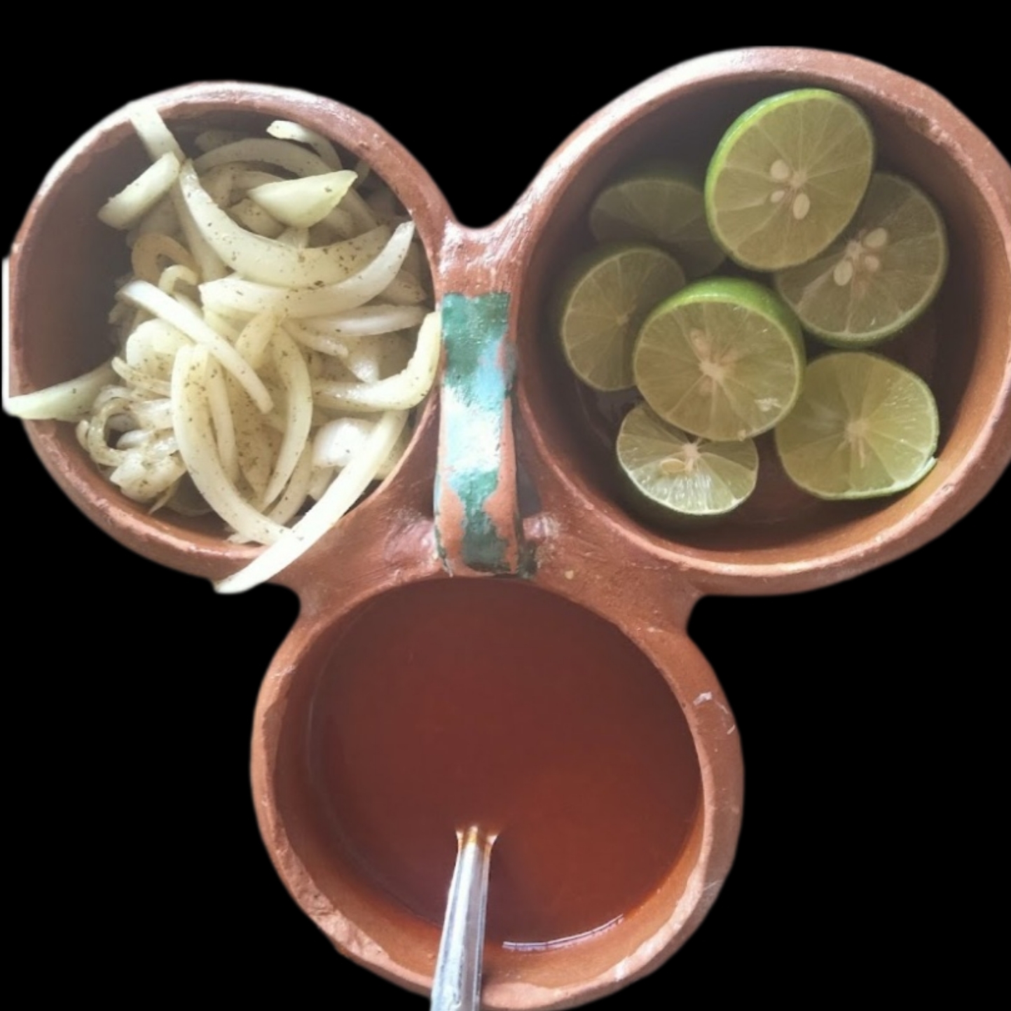 4 Tacos de carne deshebrada, lechuga, cuernitos, salsa de tomate, chile de árbol y limón.