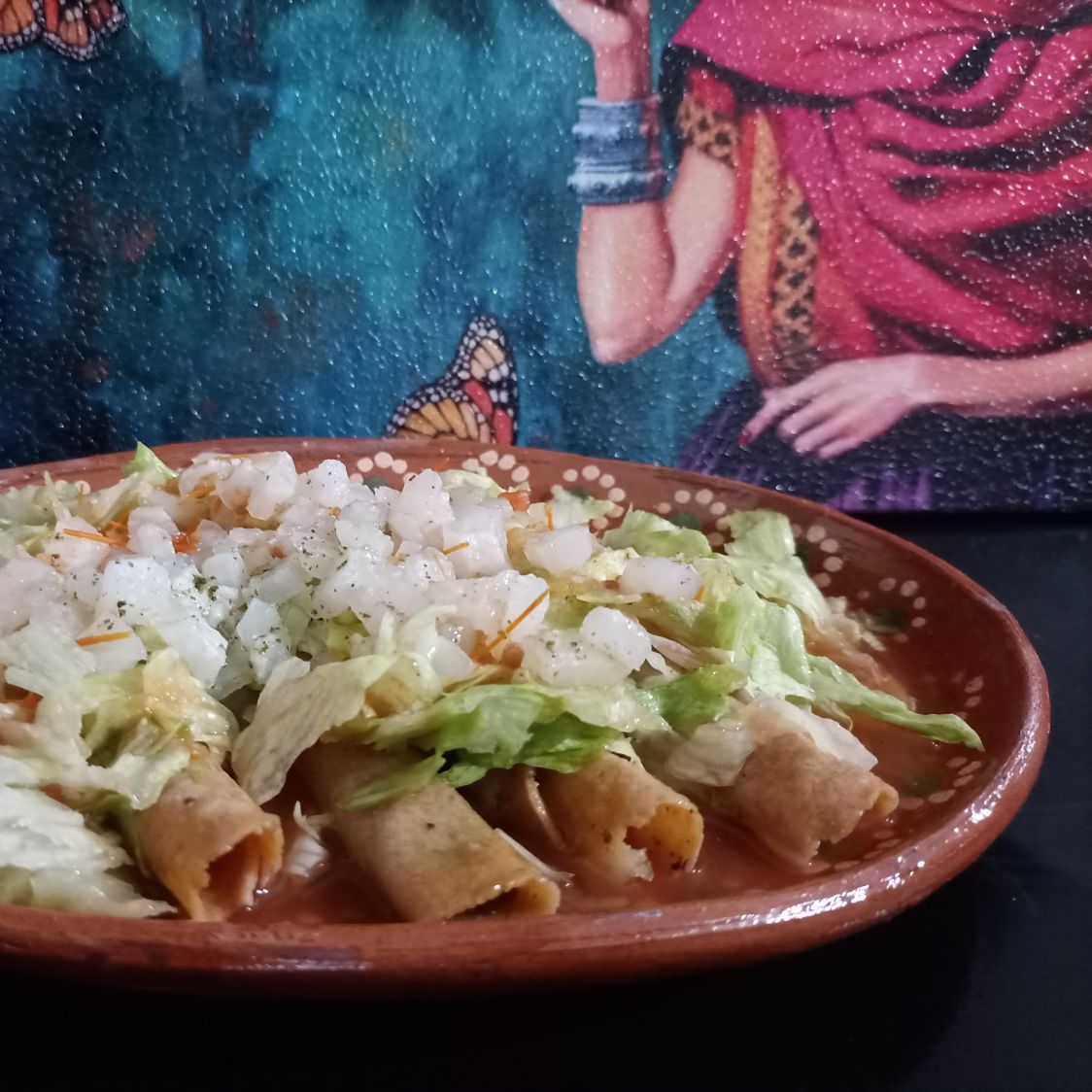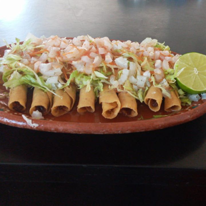 8 taquitos dorados de carne Deshebrada incluye Lechuga, cueritos, salsa de tomate , salsa picosita de árbol y limones