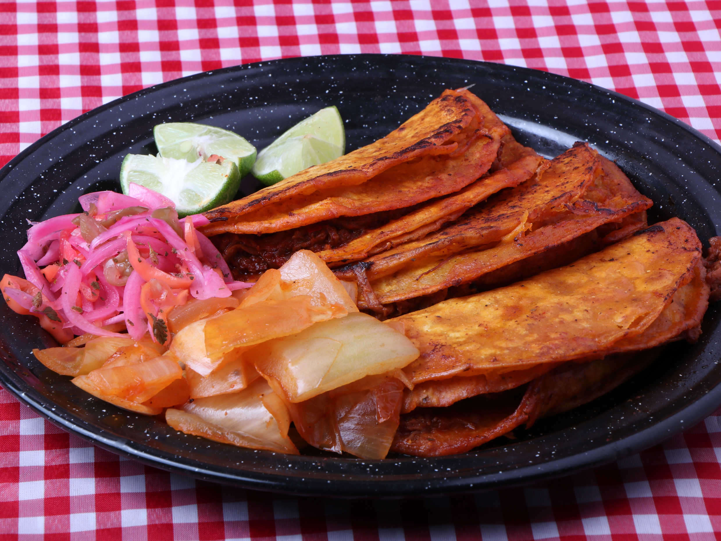 5 Taquitos taqueros acompañados de Cebollas asadas limones y salsa