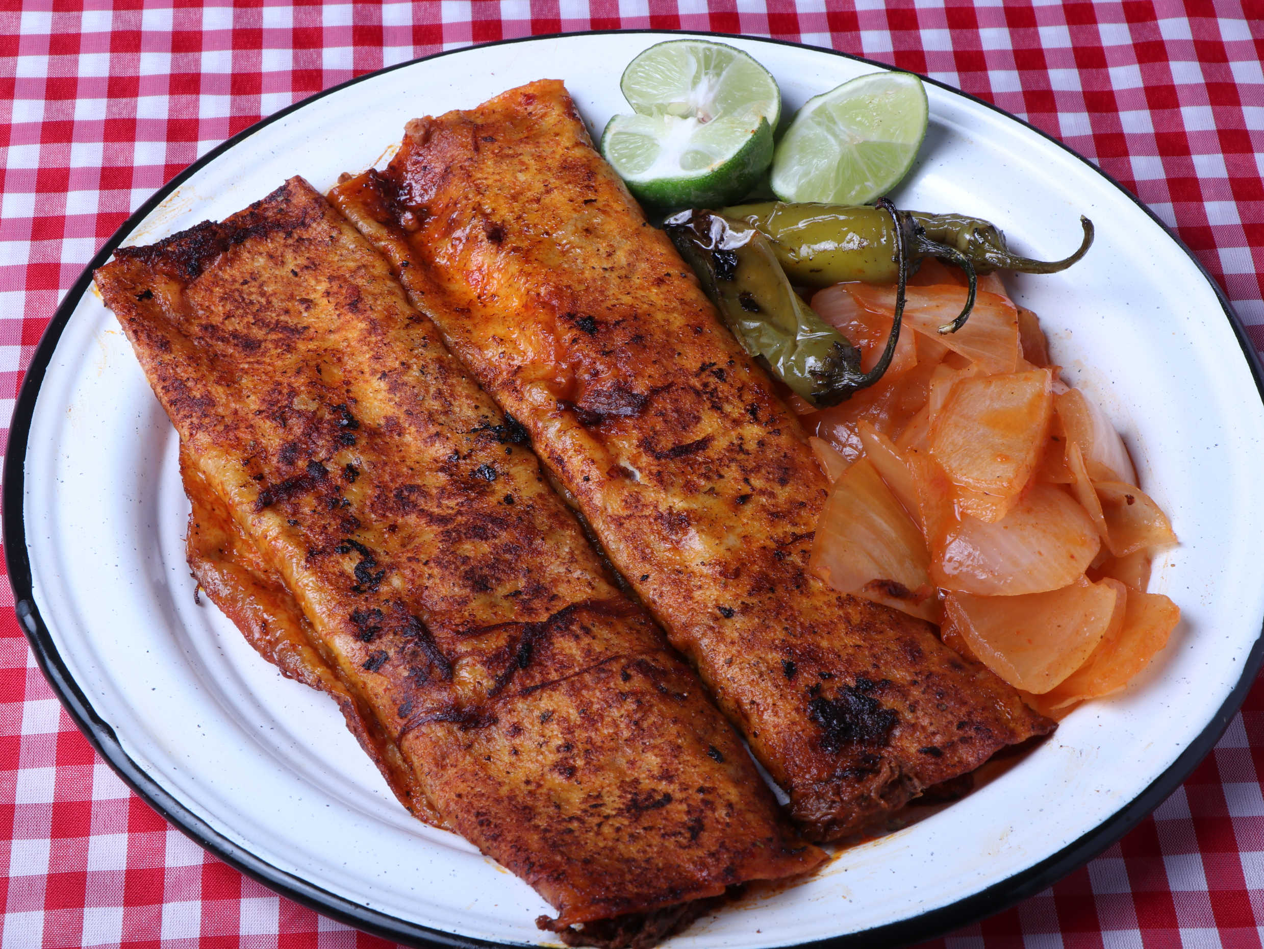 2 Burritos a la Diabla Sencillos acompañados de Cebollas asadas limones y salsa