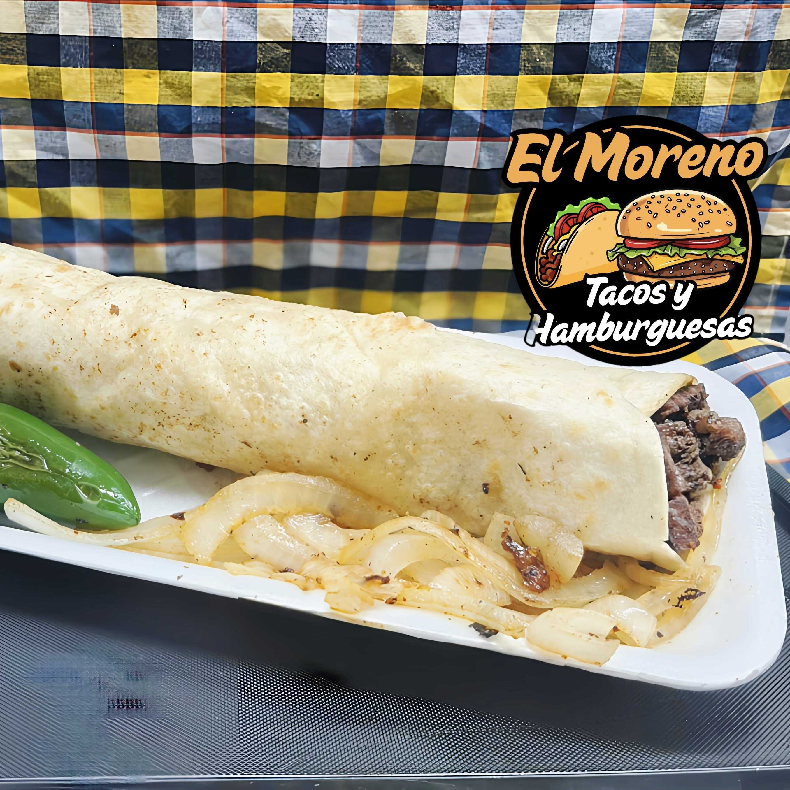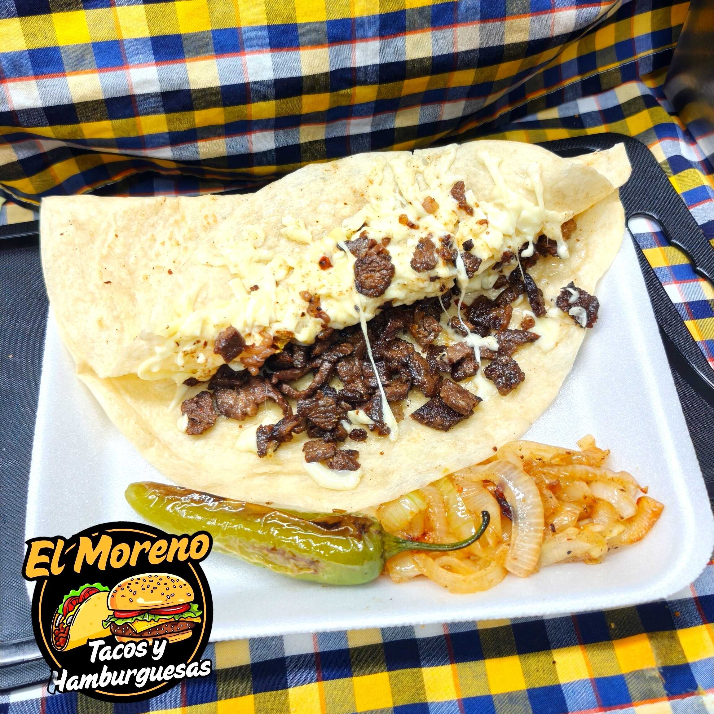 Tortilla de harina más porción de carne asada con mayonesa más cebollita y chile toreado
