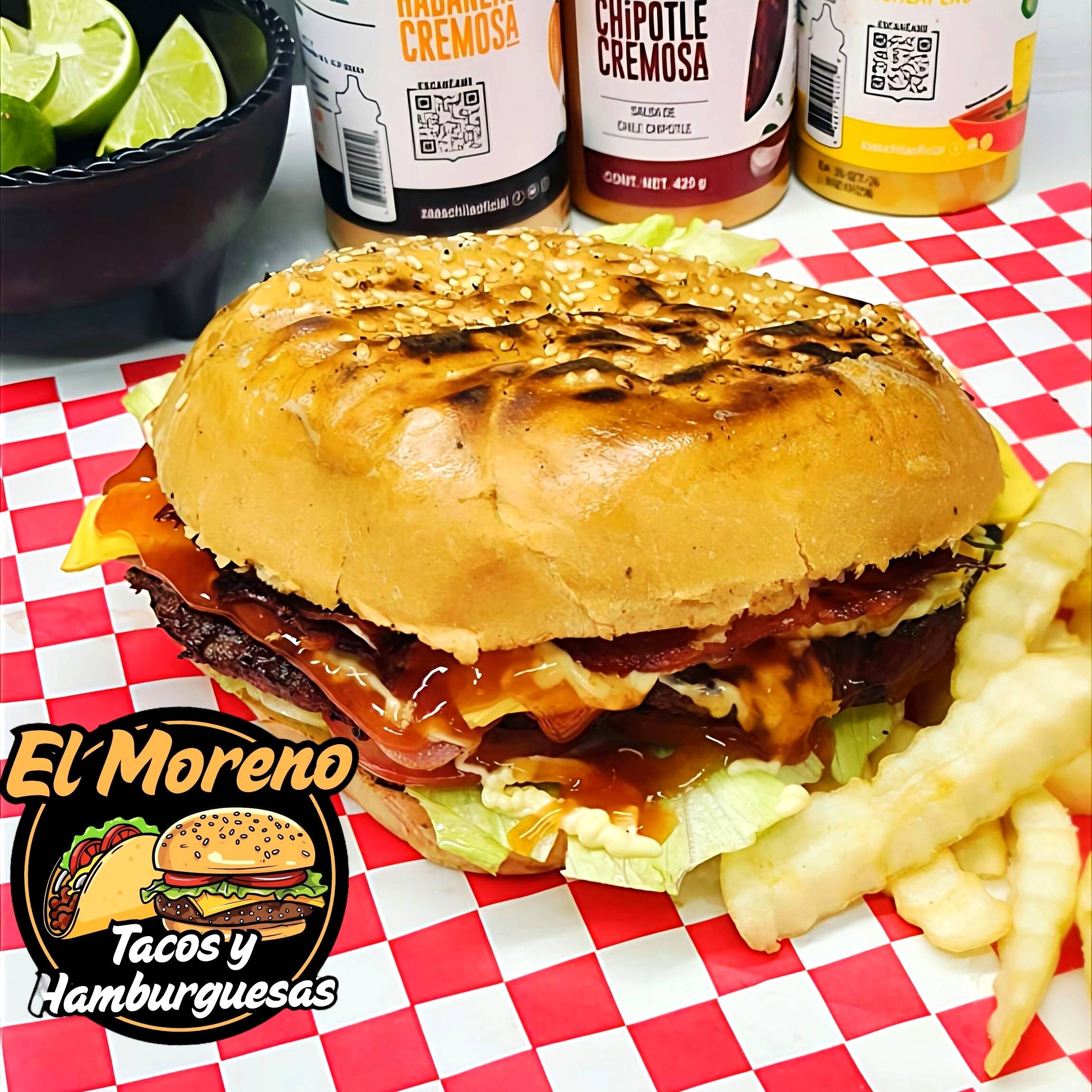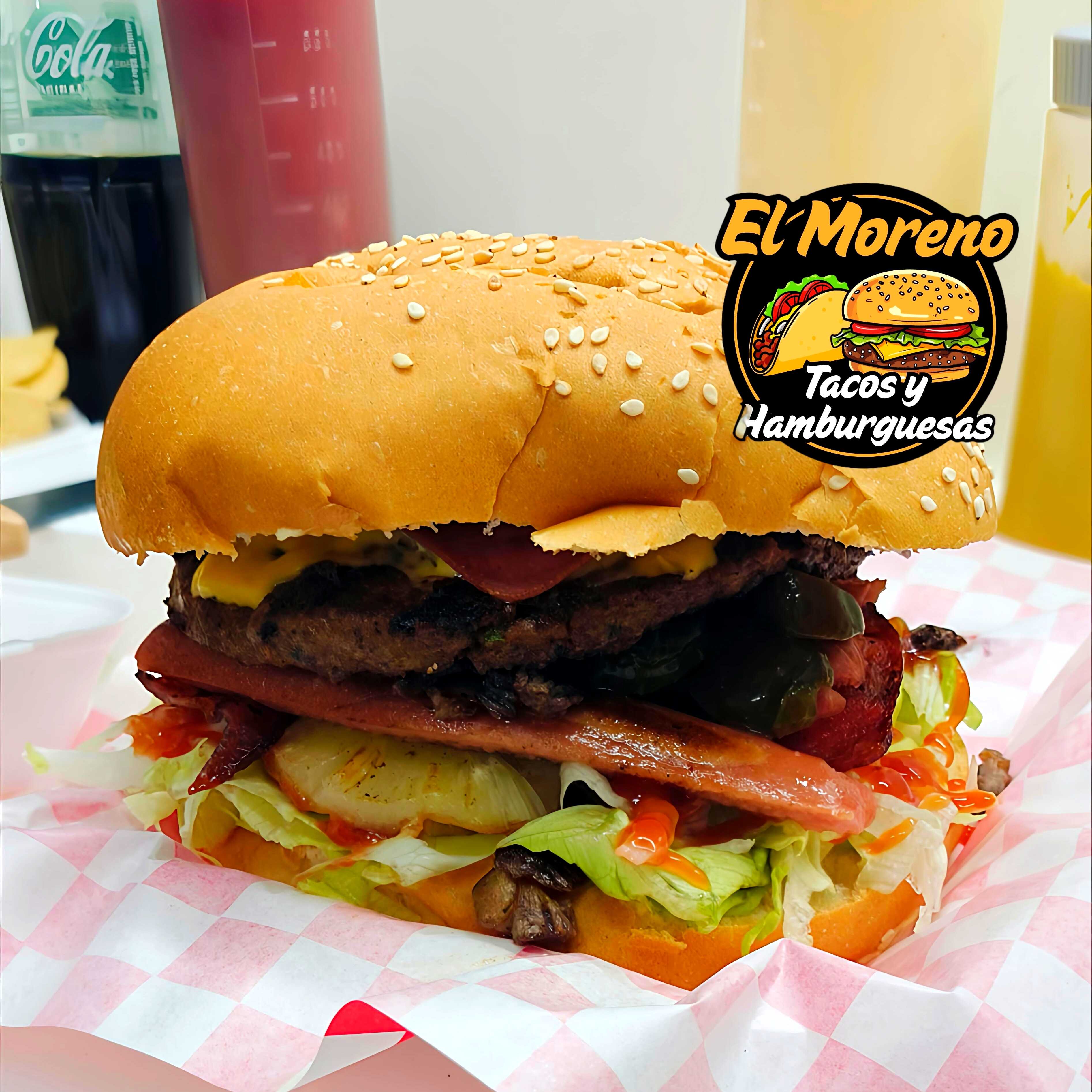Salchicha Jumbo, Tocino, Carne de hamburguesa, Carne a elegir (Asada, Pastor, Deshebrada), Mayonesa, Catsup, Mostaza, Pico de gallo o rajas.