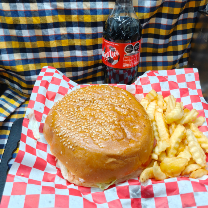 Hamburguesa sencilla con porción de papas y refresco coca cola 450ml