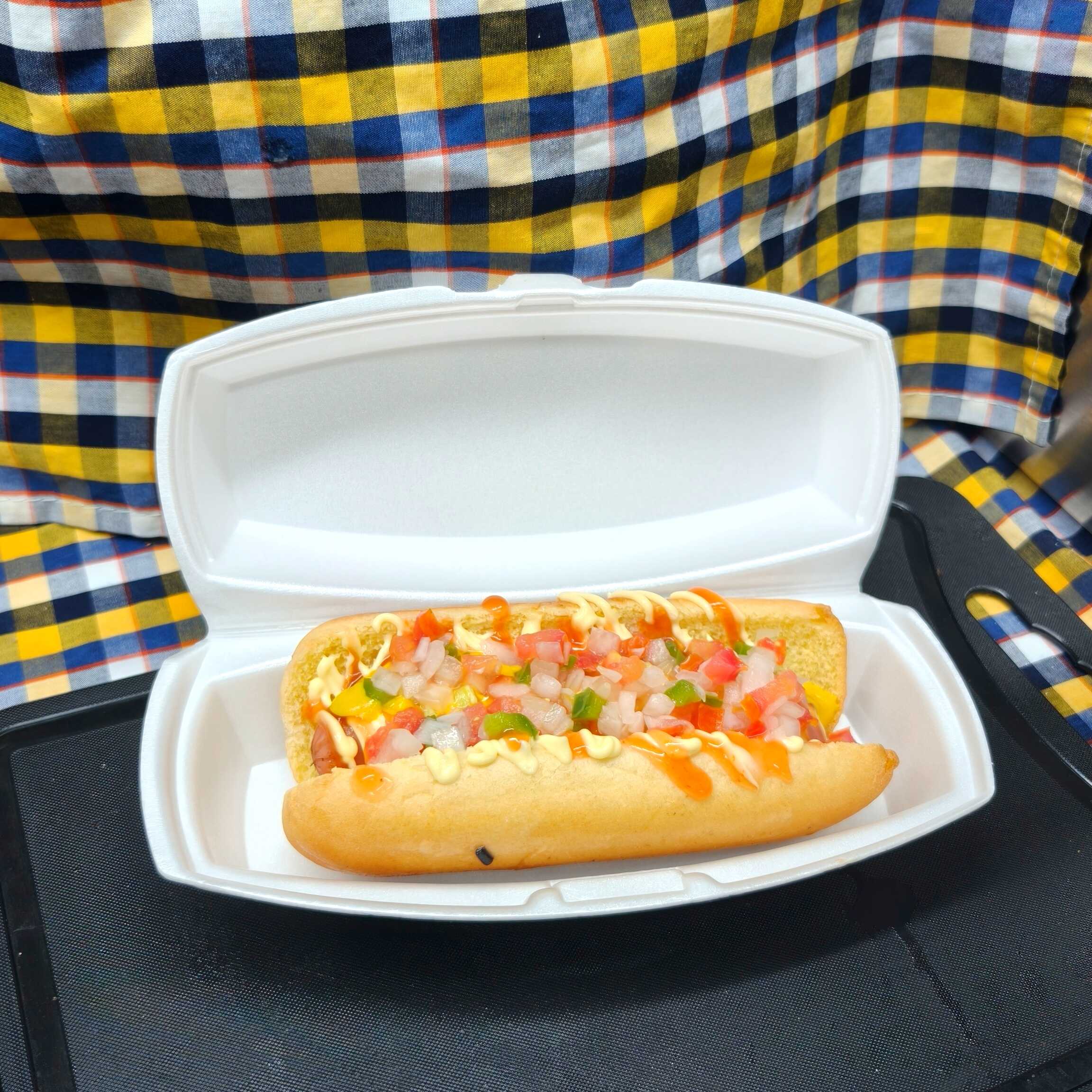 Salchicha, Mayonesa, Catsup, Mostaza, Pico de gallo o rajas.