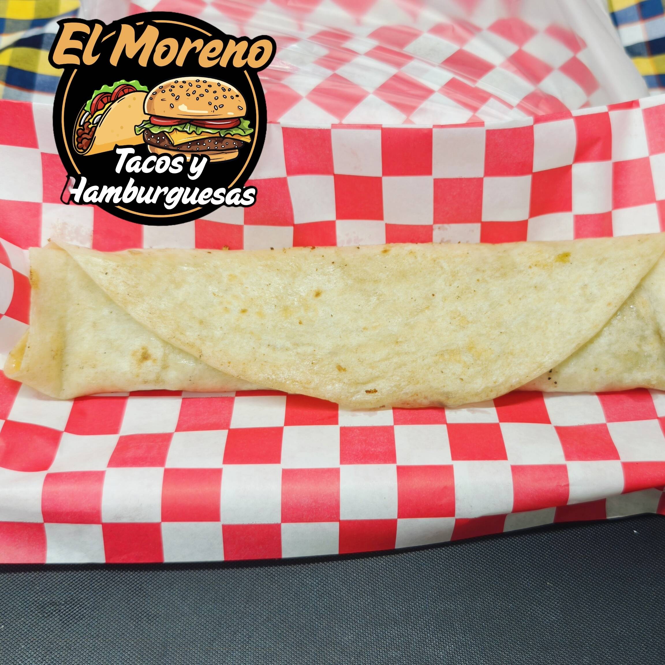 Tortilla de harina más porción de carne deshebrada en salsa verde con mayonesa