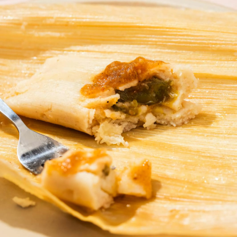 Tamal de rajas poblanas con queso, envuelto en hoja de elote.