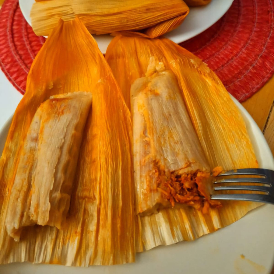 Tamal de cerdo en salsa roja, envuelto en hoja de elote.