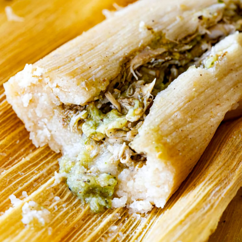 Tamal de cerdo en salsa verde, envuelto en hoja de tamal.