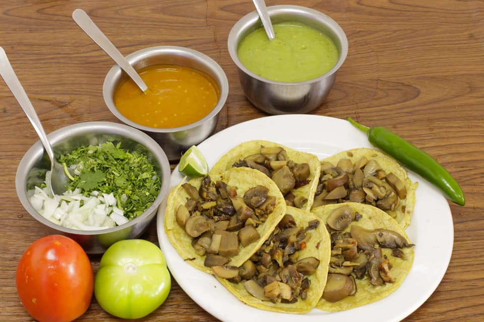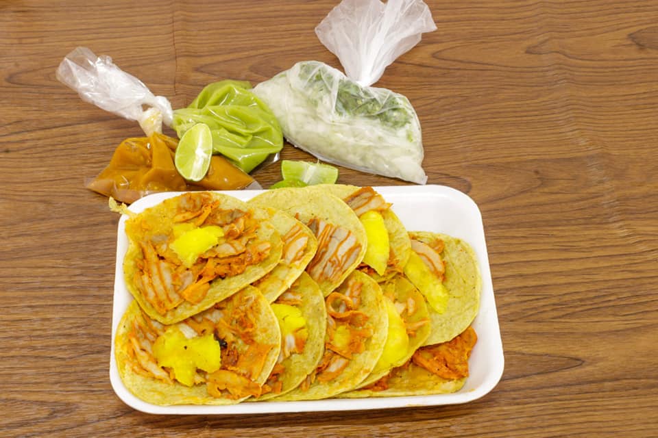Pastor, salsas, verdura, 40 tortillas y piña.