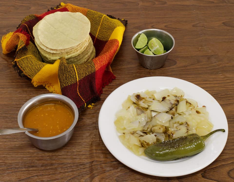 Fajitas de bistec, arrachera, pastor, chuleta, cebollitas y queso 12 tortillas.