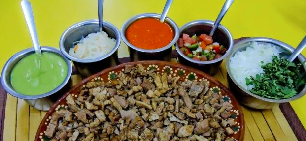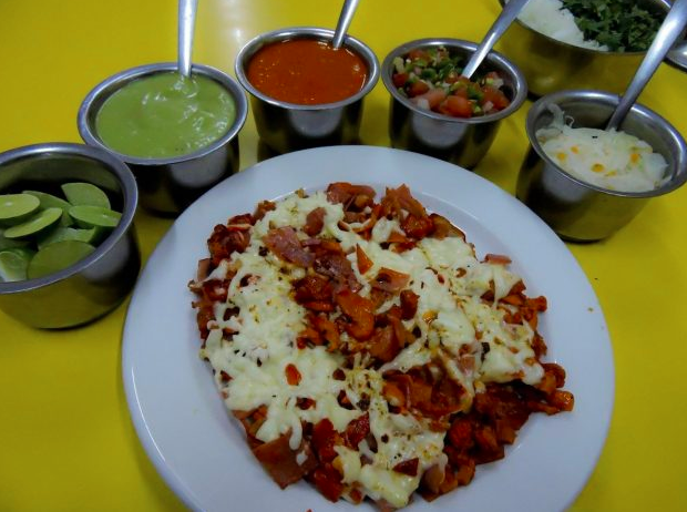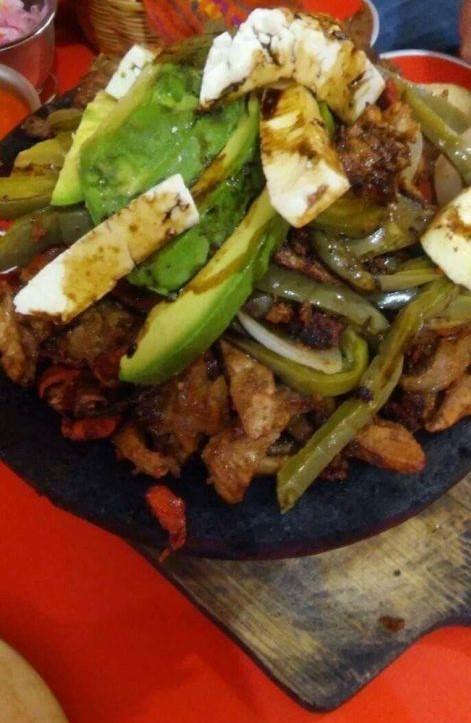 Pastor asada, chuleta, chorizo, queso, aguacate, cebollitas nopales y salsa.