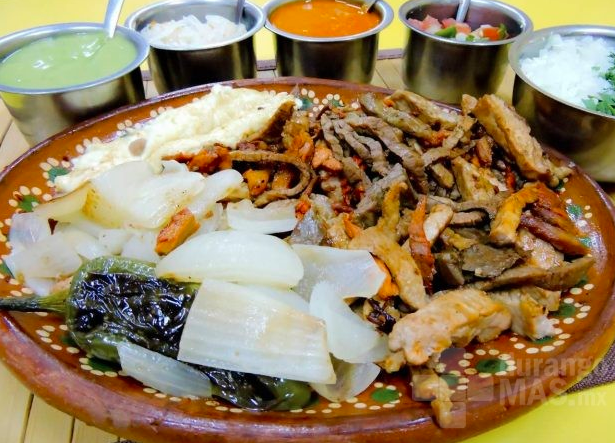 Asada, queso panela, cebollitas, nopales, aguacate y chorizo.