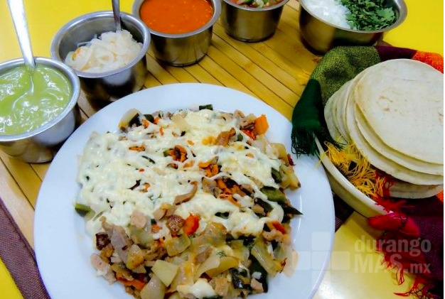Chile morron, cebolla, tocino, pastor, asada y queso.