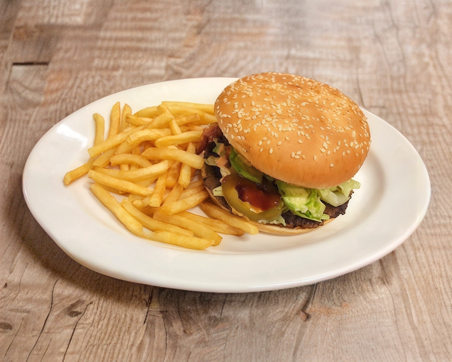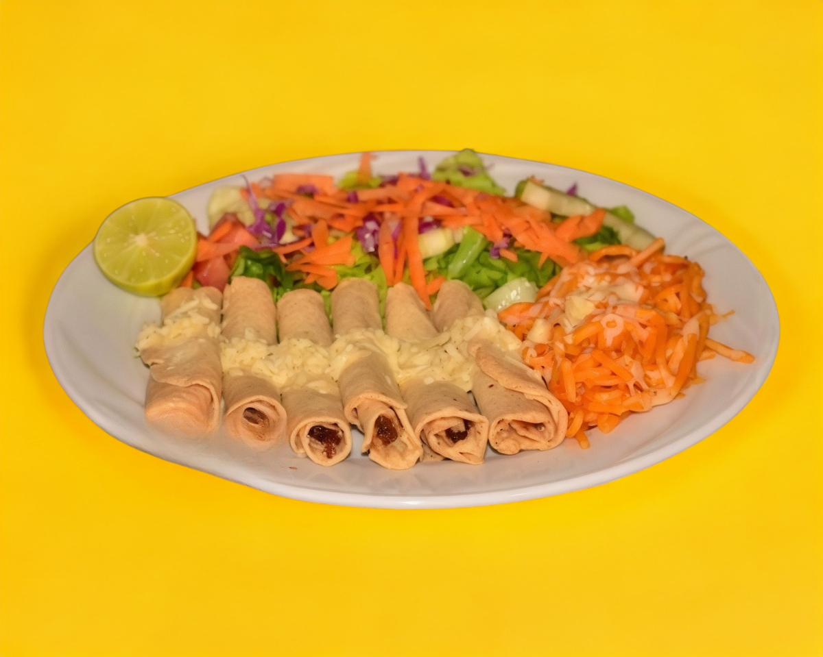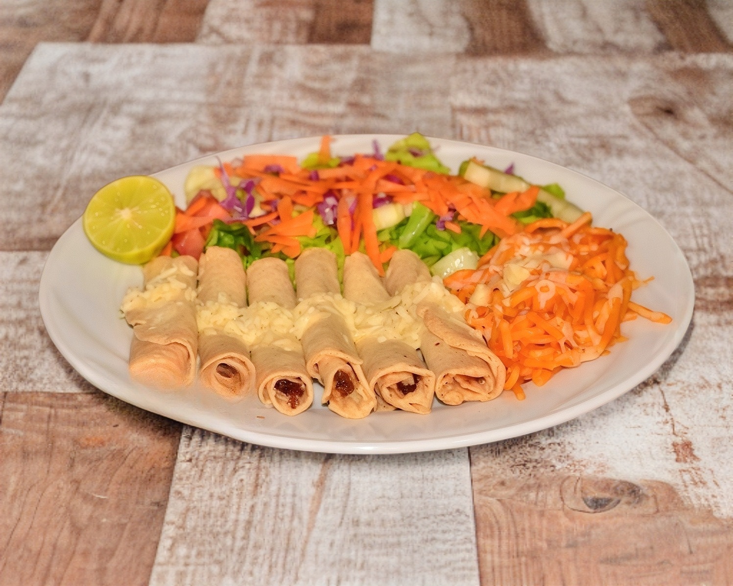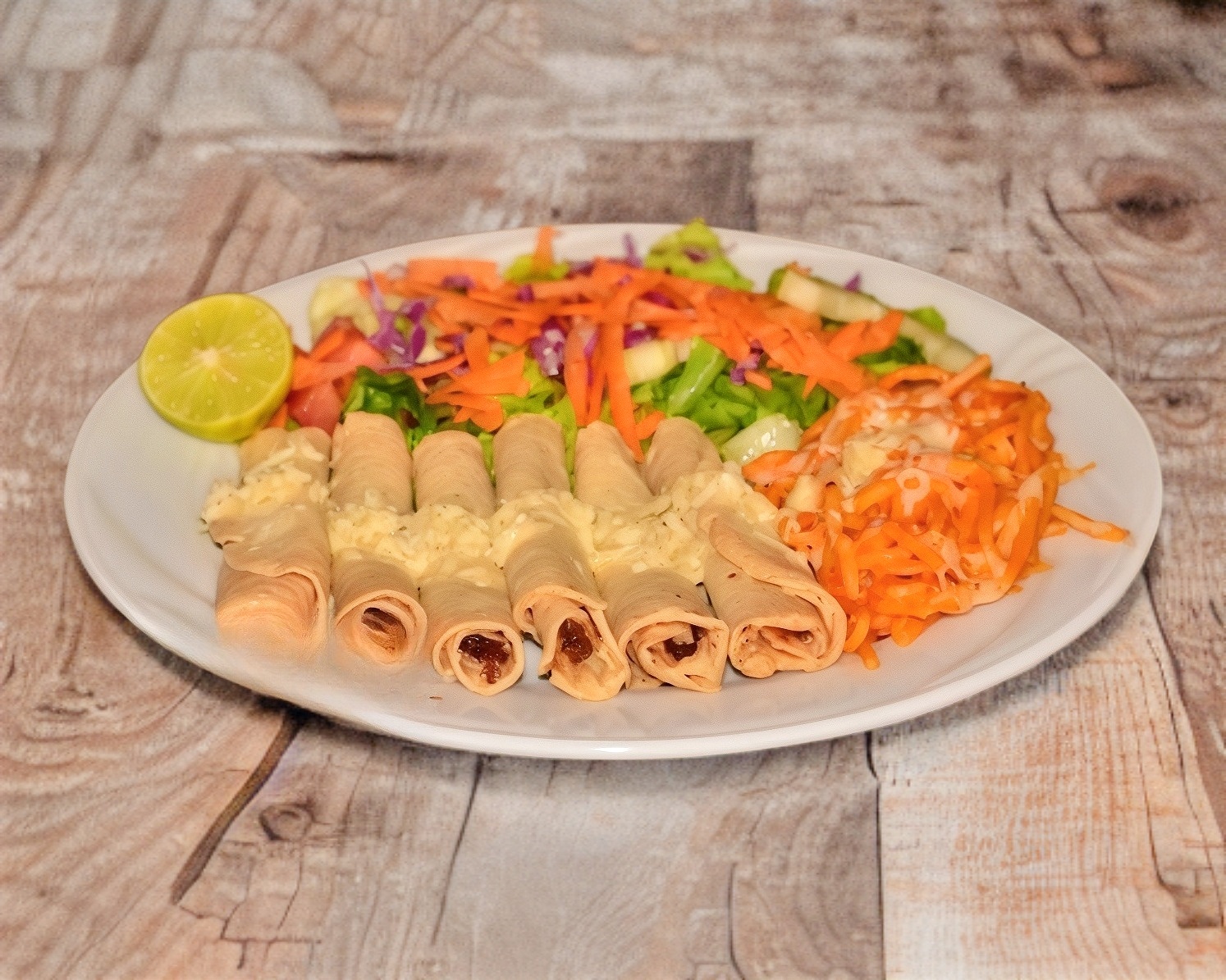 Acompañada de ensalada, frijoles, papas y cebolla asada.
