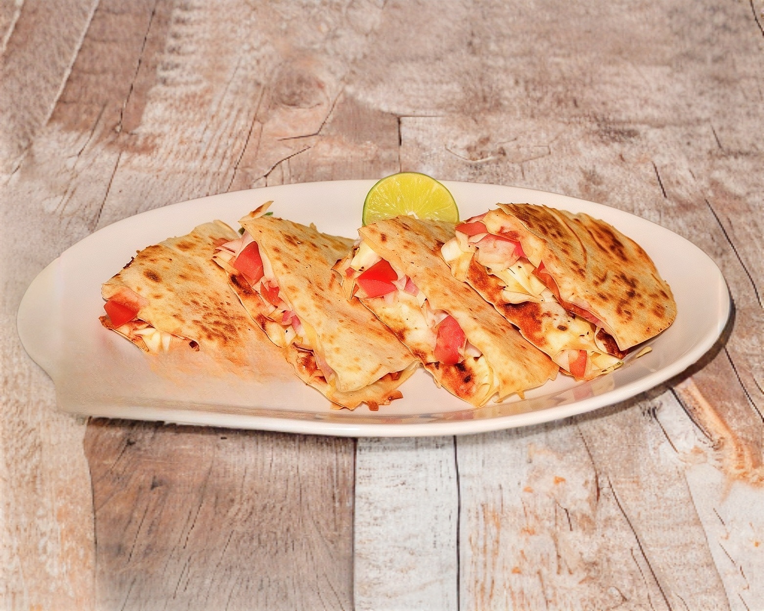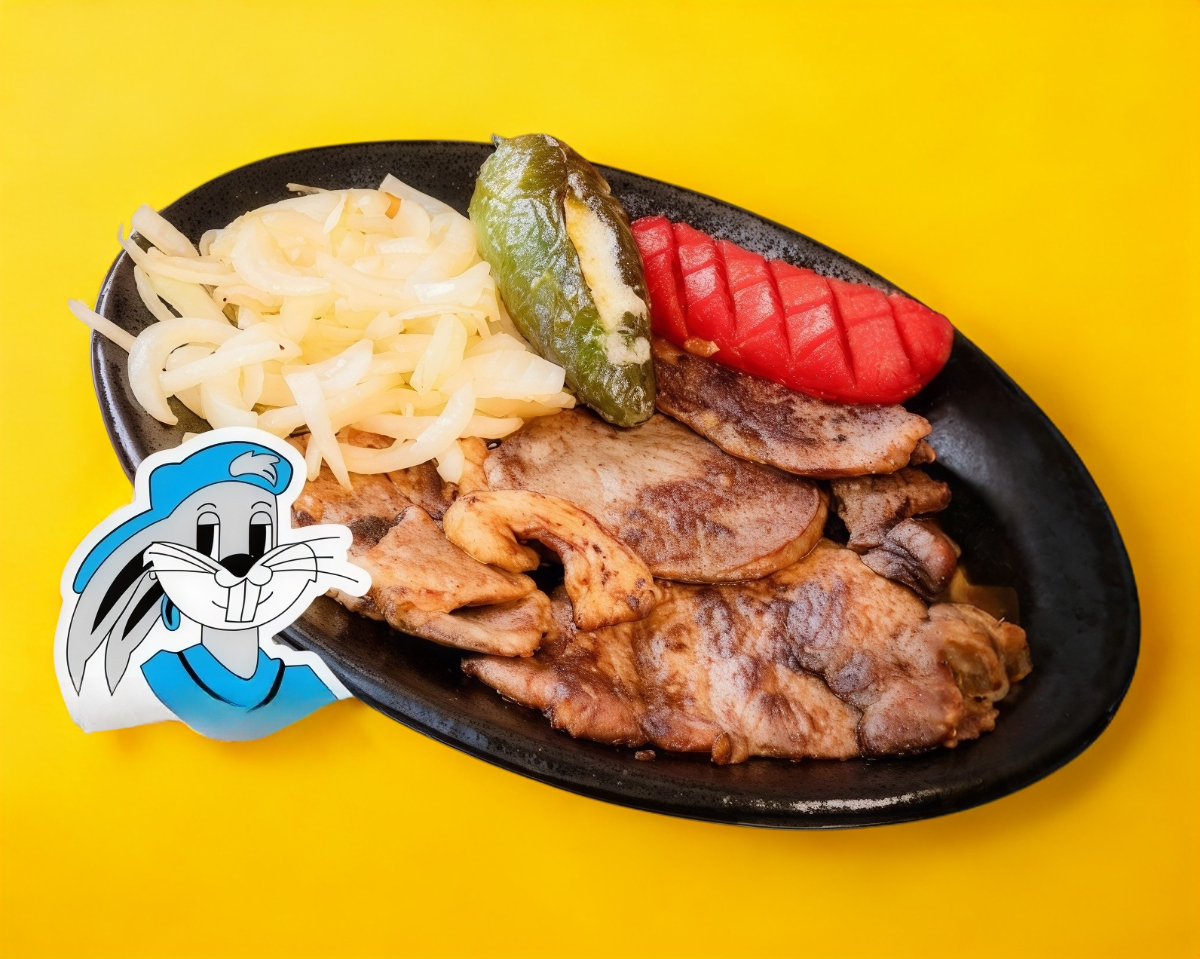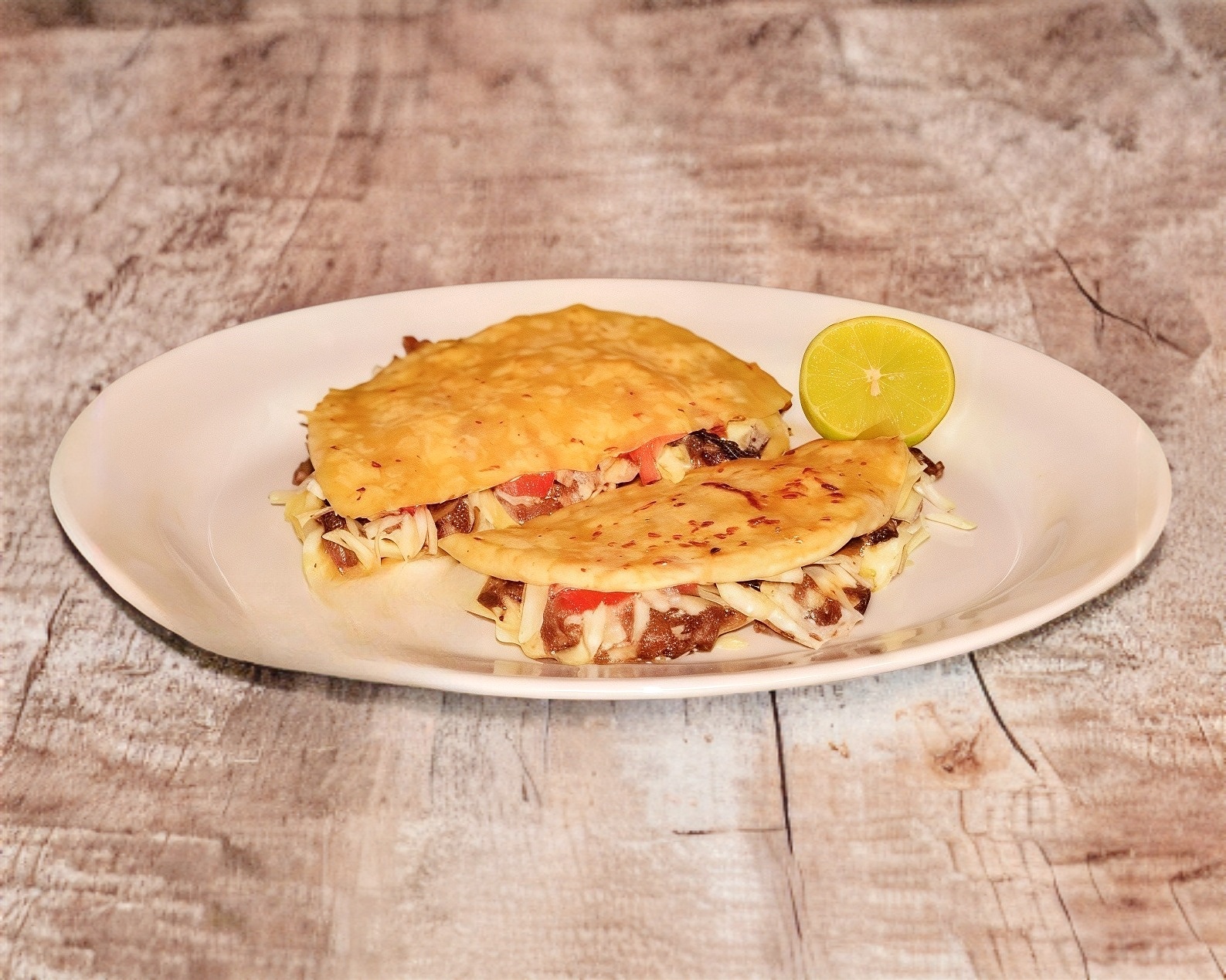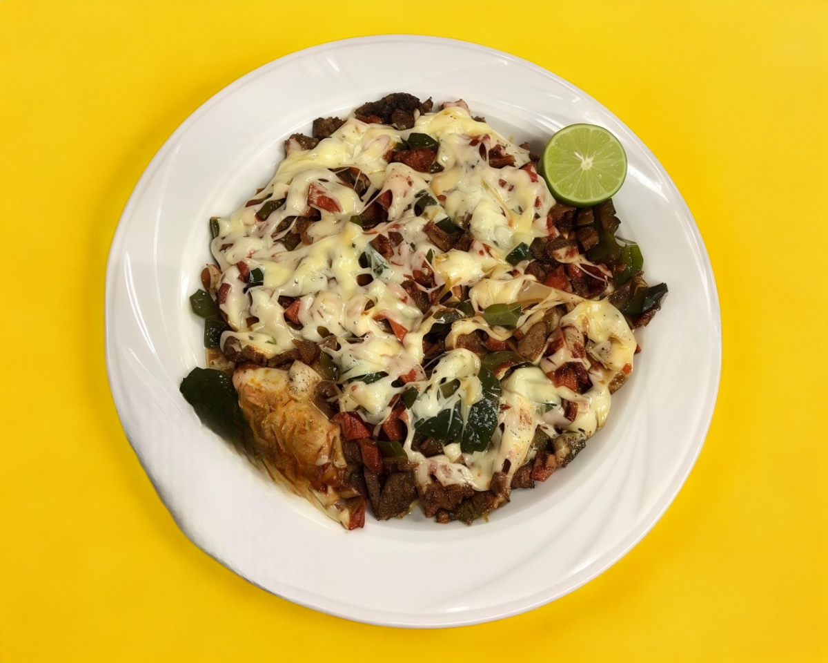 cebolla, chile poblano, tocino, queso gratinado, barbacoa de res,tortilla de harina y de maiz