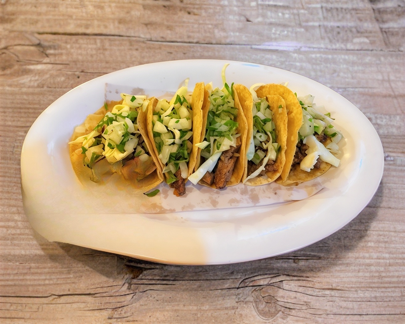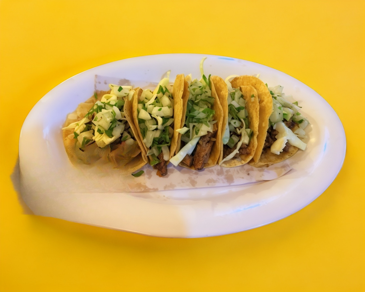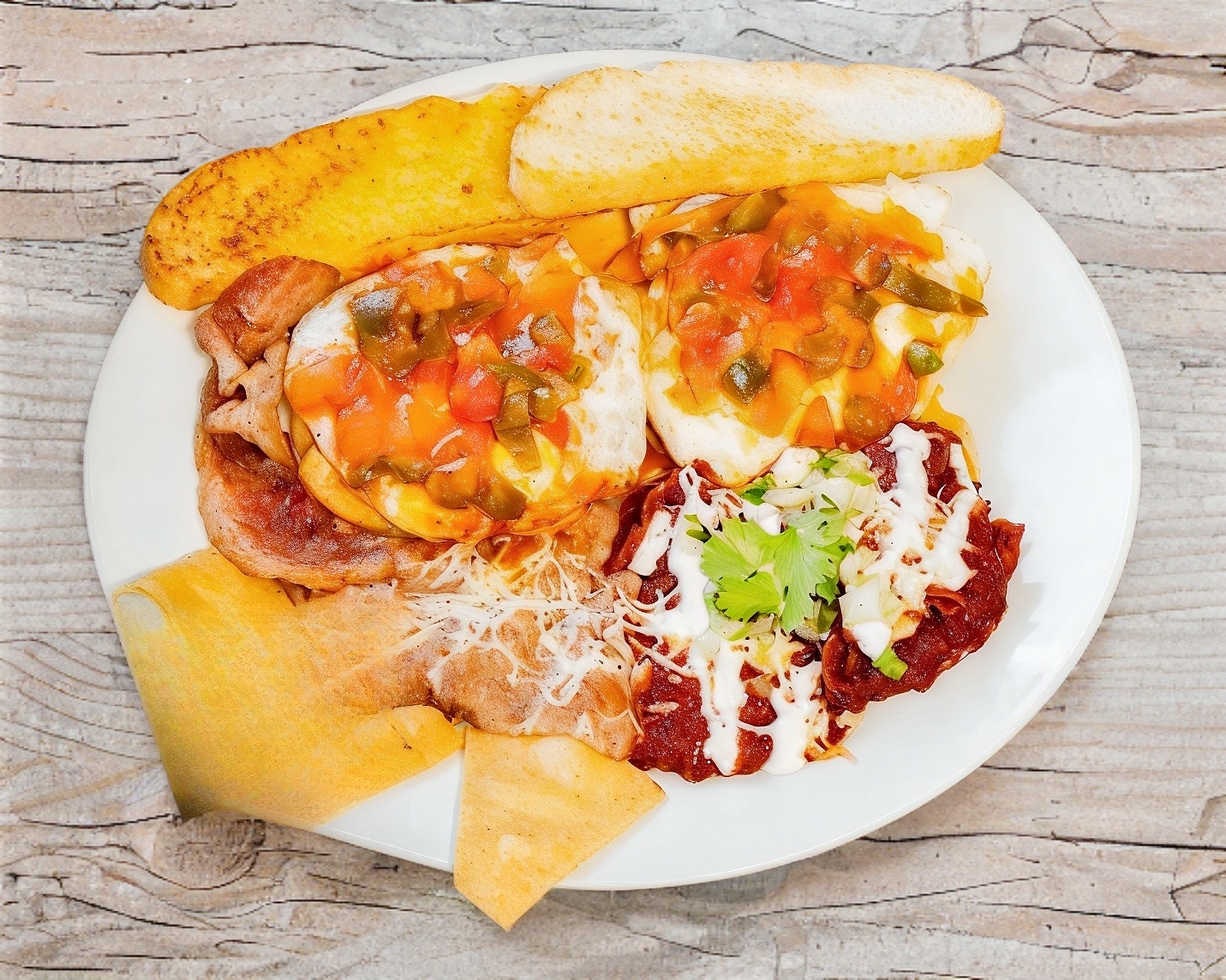 cebolla, chile poblano, tocino, queso gratinado, barbacoa de res,tortilla de harina y de maiz