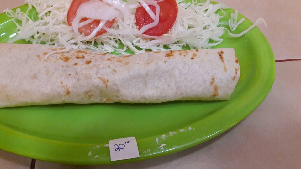 De carne, papa o frijol acompañado de repollo, tomate y cebolla.