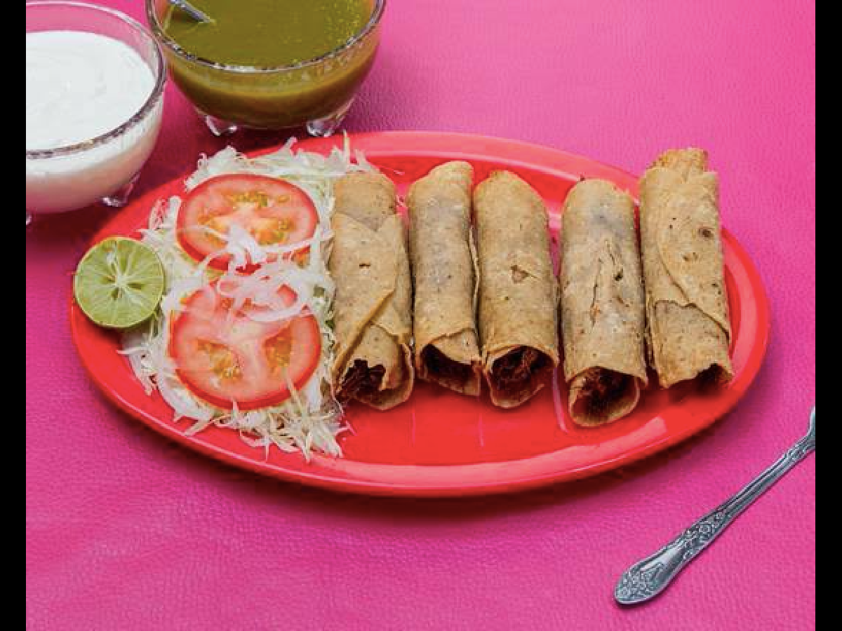 Doble tortilla de maíz con doble relleno de carne deshebrada, acompañado de repollo, tomate y cebolla.