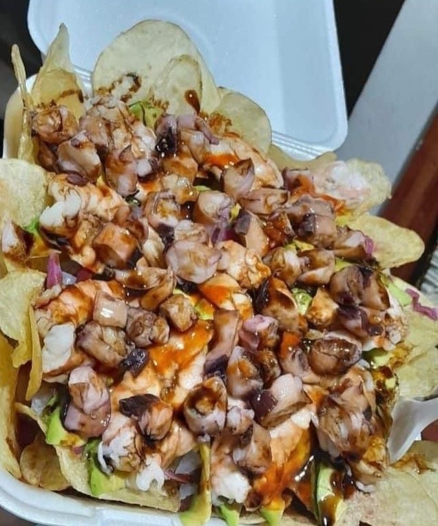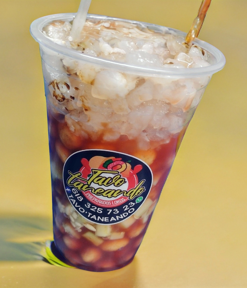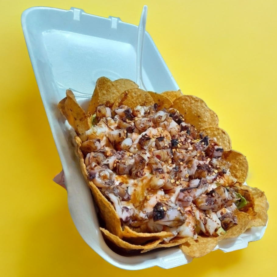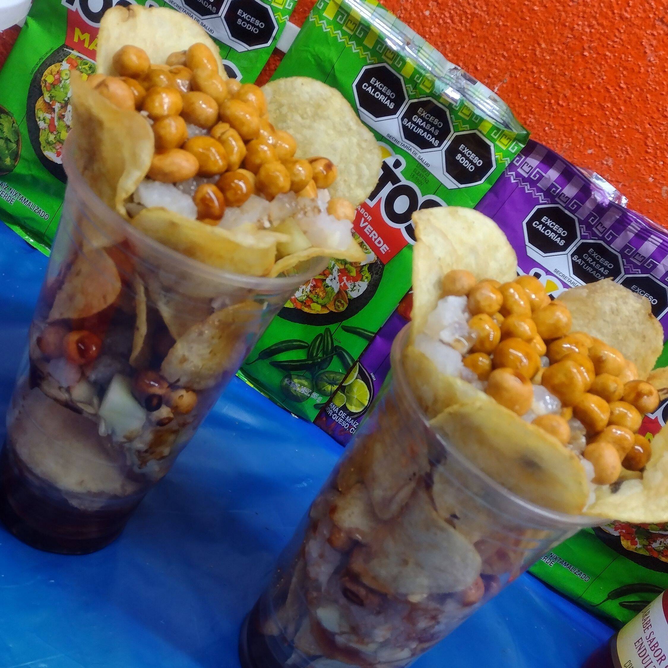 Pepino, aguacate, mango, cebolla picosita, camarón, pulpo, chile de árbol en polvo, maggi y tostitos de tu elección