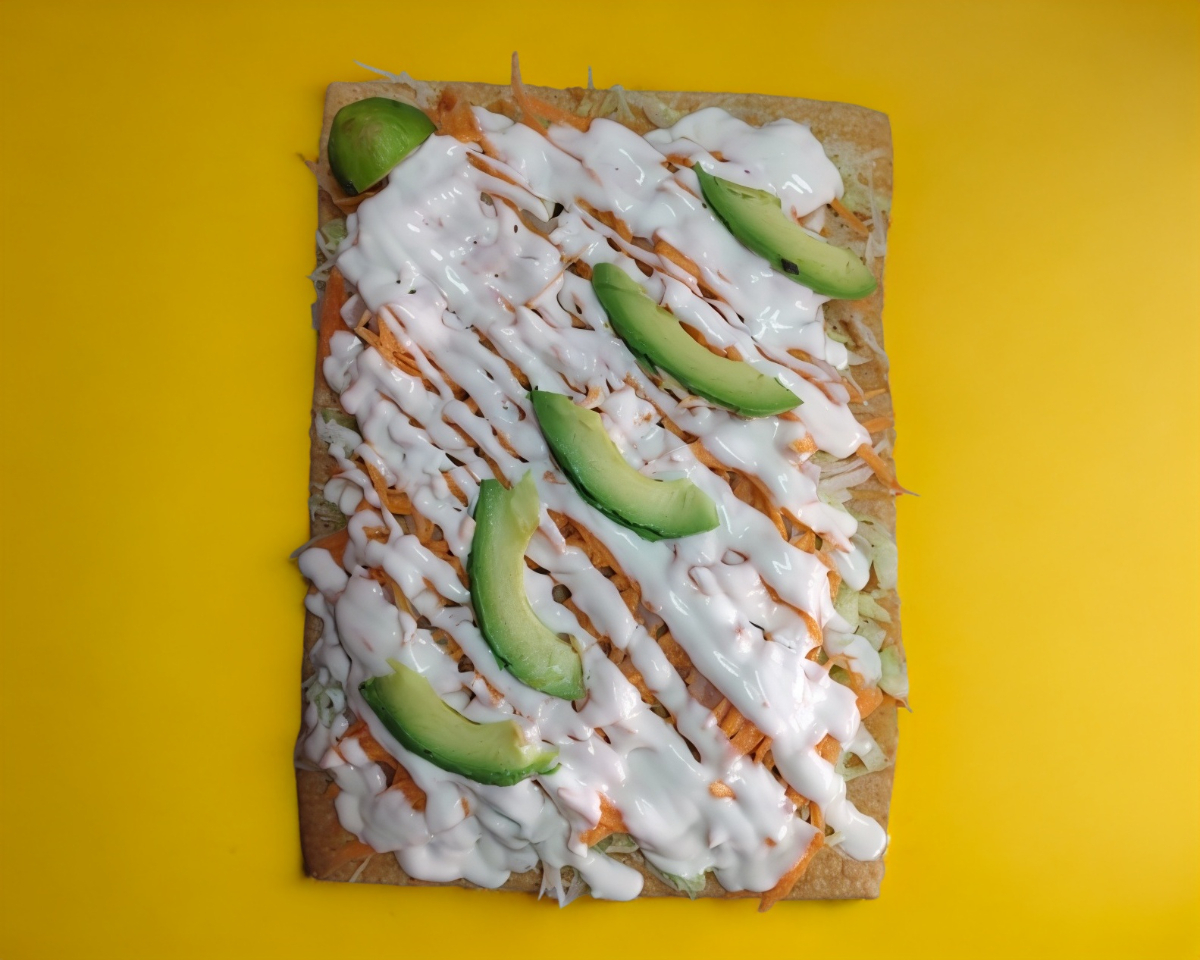 Duro, lechuga, pepino, cueritos, tomate, aguacate, limón y crema.