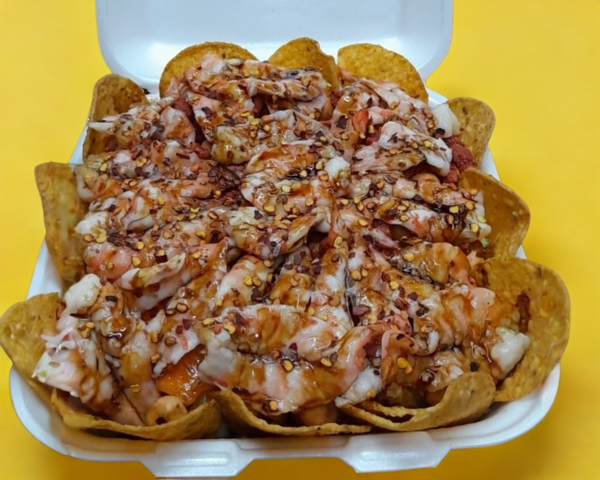 Tostitos de tu elección, pepino, cebolla morada picosita, aguacate, maggi, cacahuate, rielitos, mango o Piña, camarón, salsa de aguachile y chile en polvo