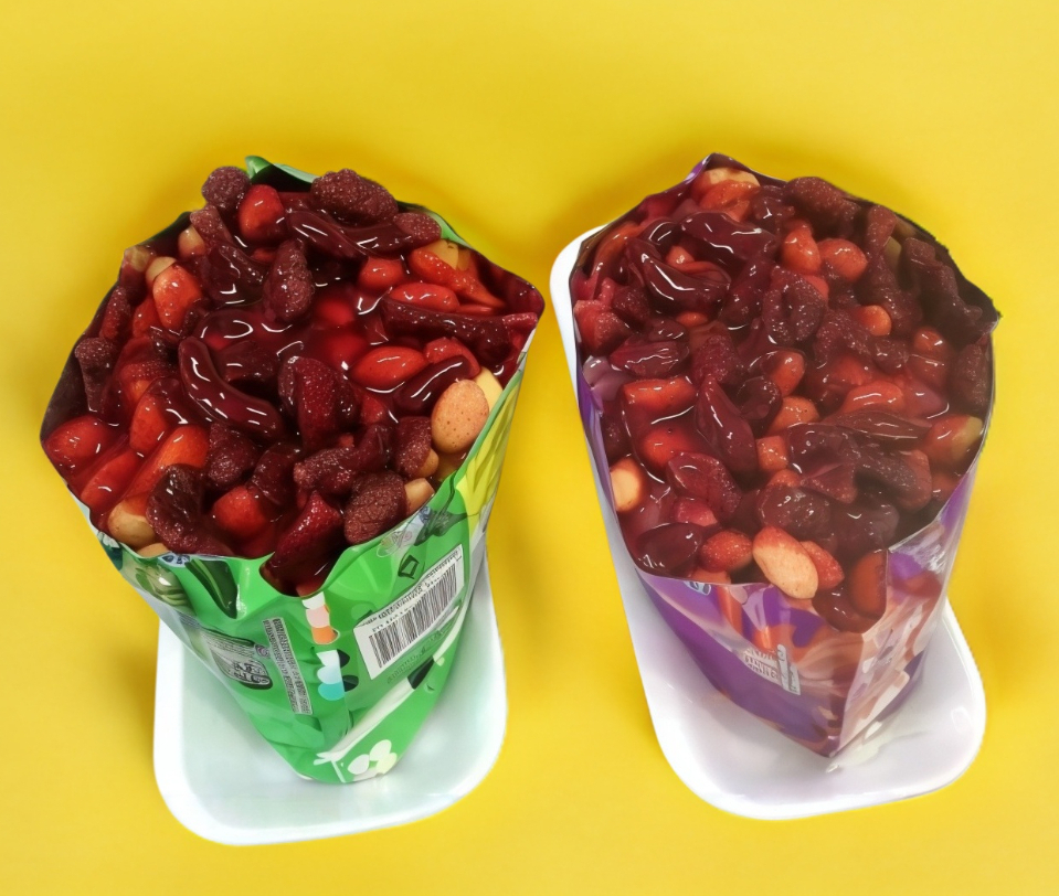Tostitos de tu elección, jícama, pepino, piña, cacahuates japonés, miguelito, rielitos y chamoy.
