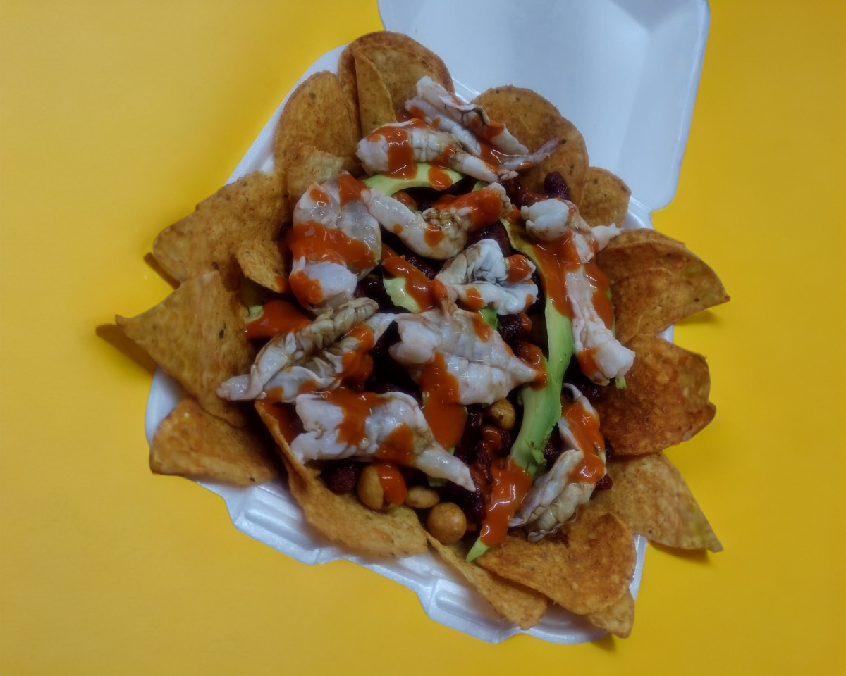 Tostitos de tu elección, cebolla morada picosita, pepino, aguacate, cacahuate, rielitos, camarón, maggi, salsa de aguachile y chile de árbol en polvo