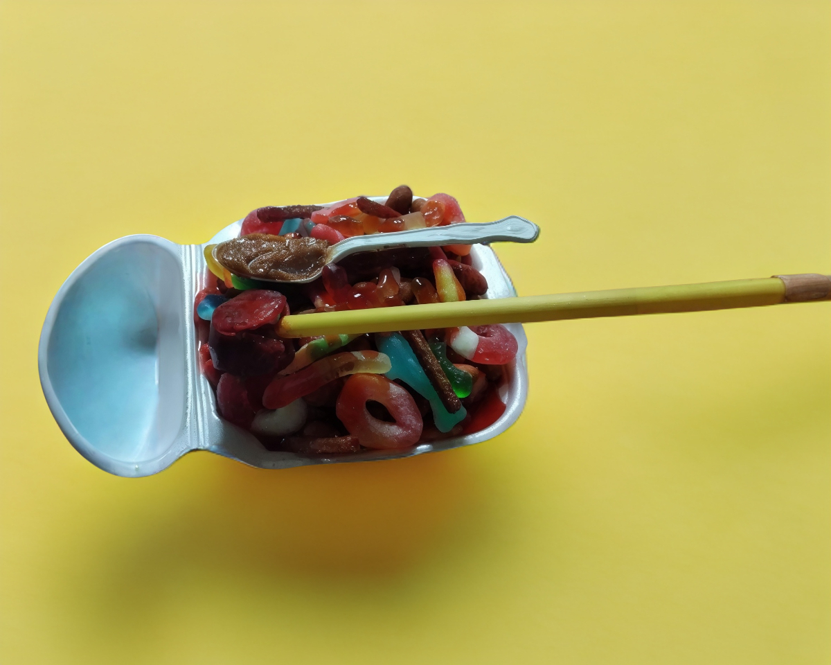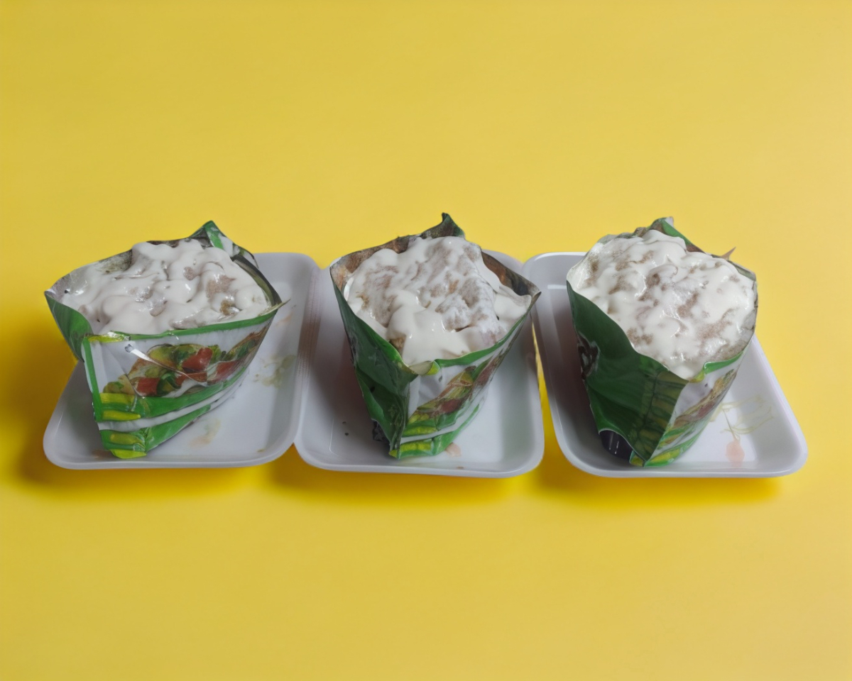 Papa natural, chamoy, miguelito, limón, banderilla de tamarindo y variedad de gomitas.