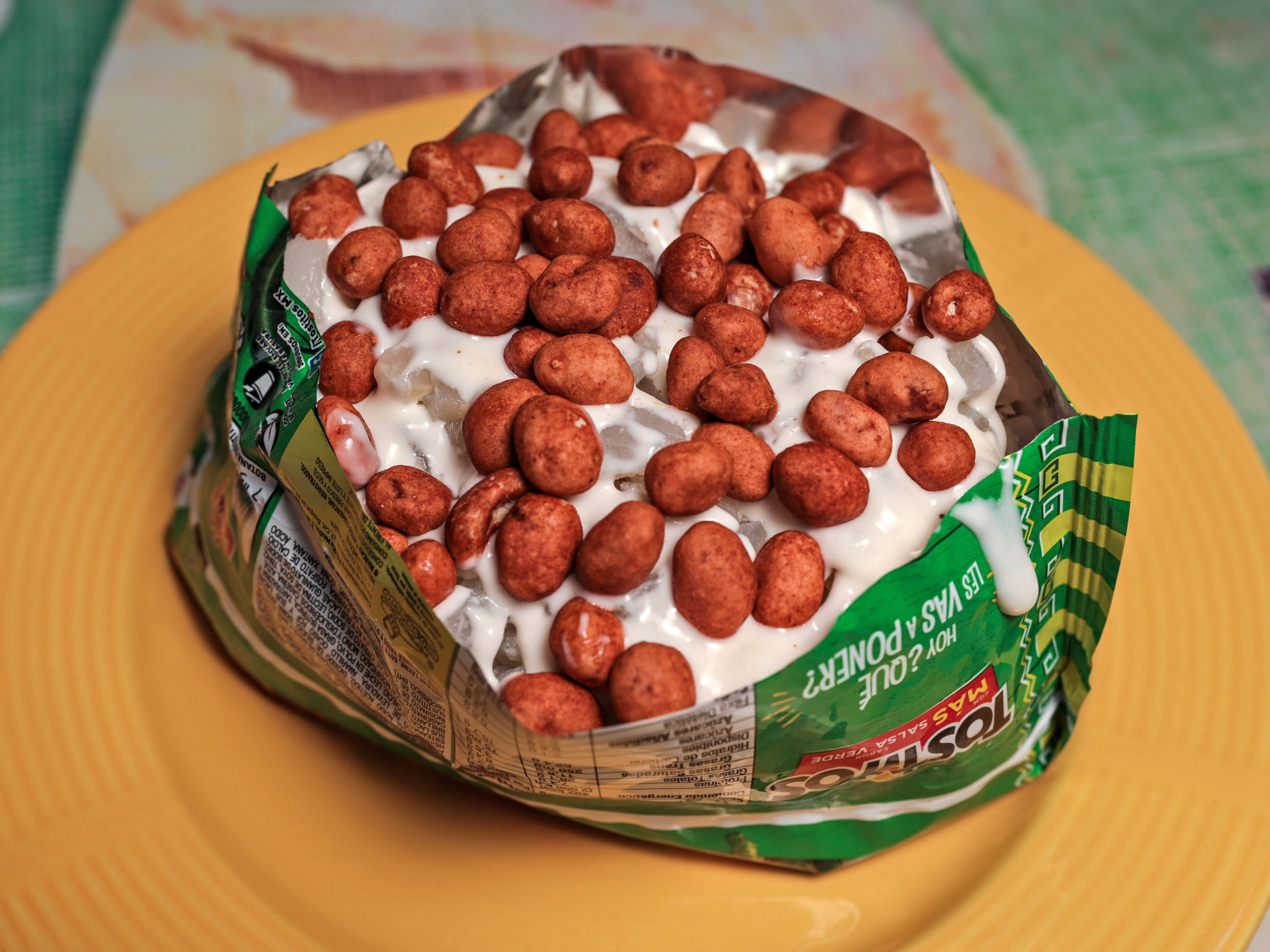 Tostitos de tu elección, lechuga, pepino, cueritos, cacahuate japonés, crema.