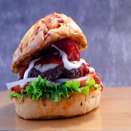 130 gr. de fresca carne de res, queso gratinado, pan costra de queso, tocino, champiñones con queso, lechuga, tomate, jalapeño, cebolla, cátsup y ranch.