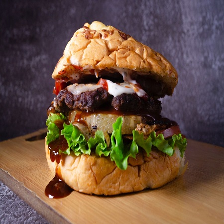 130 gr. de fresca carne de res, queso gratinado, pan costra de queso, tocino, piña, lechuga, tomate, jalapeños, cebolla carameliza, BBQ y ranch.