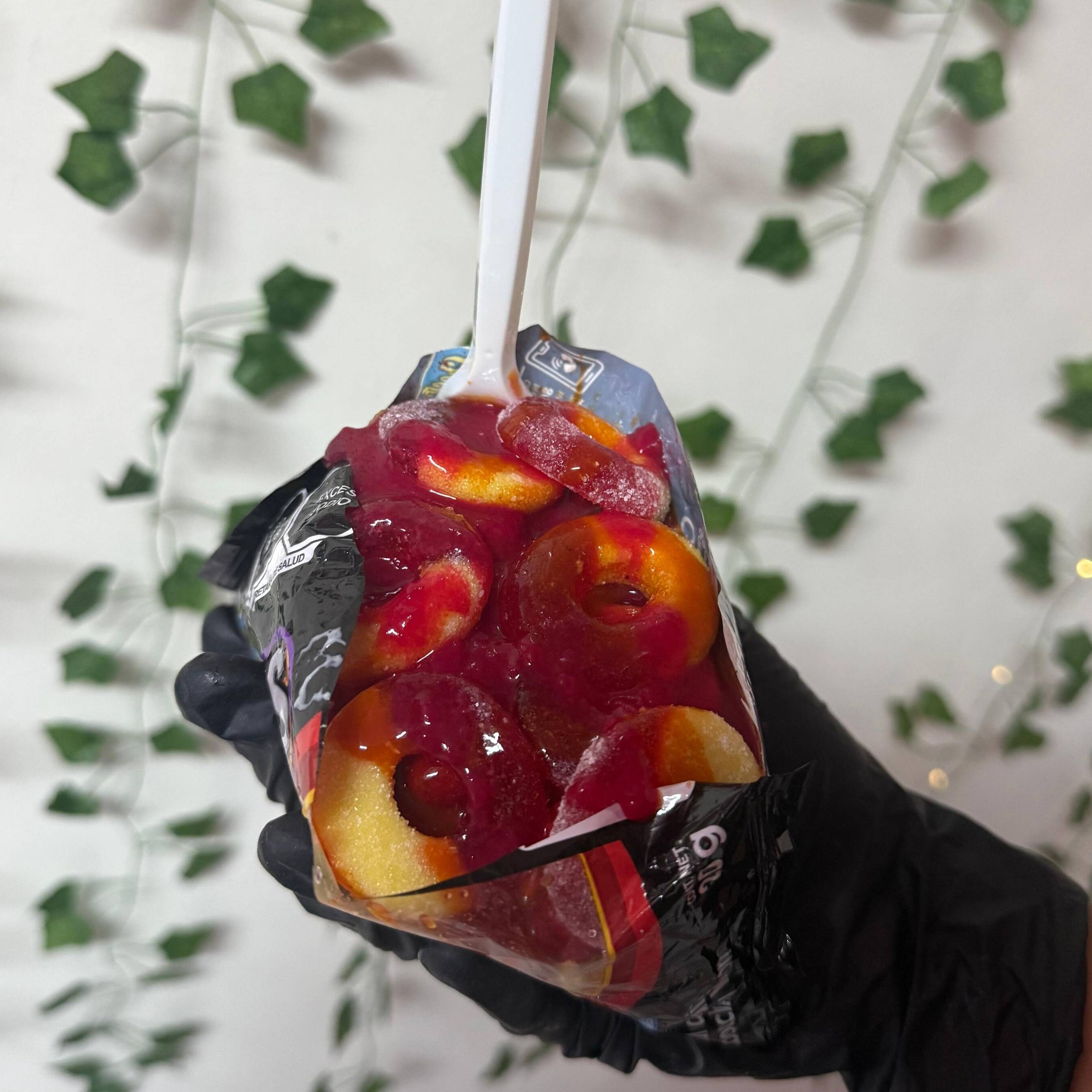 gomitas, rielitos, mango, jicama, salsa maggie e inglesa, cacahuate, cueritos, kermato