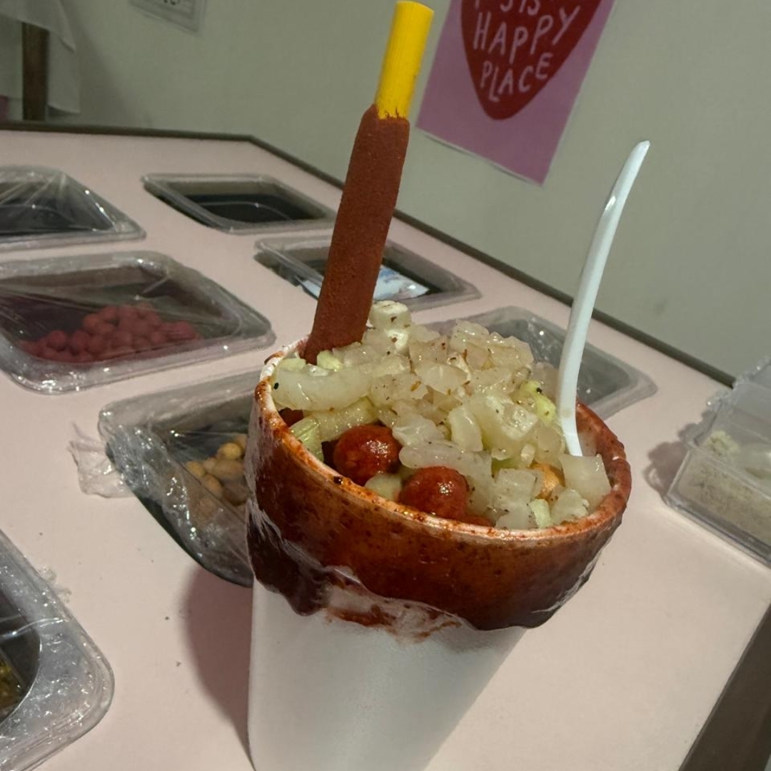 vaso de 14oz con cacahuate, pepino, jicama, kermato, gomitas rielitos, cueritos, salsa maggie e inglesa
